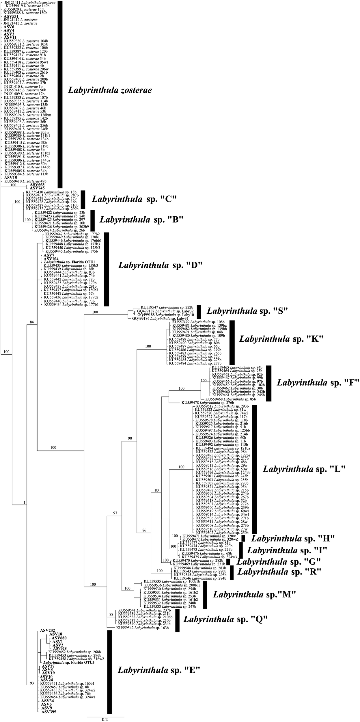 Phylogram for Labyrinthula spp. constructed using ASVs generated from ITS1 sequences from in this study (in bold) and GenBank sequences. The GTR+I+G substitution model for the Bayesian analysis was used to compute this topology, and posterior probabilities (>90) are included at the nodes. See text for additional details.