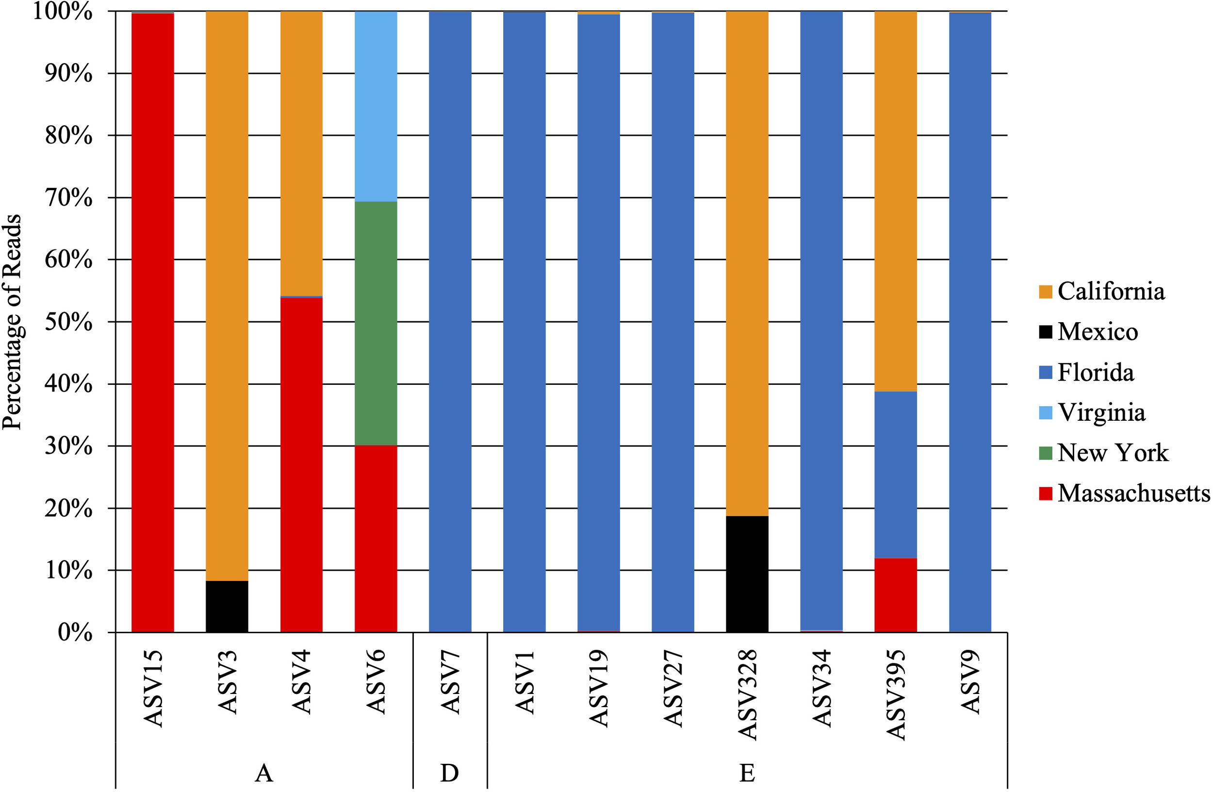 Percentage of reads detected across geographic locations from the 12 ASVs that were detected in more than one location. Note that 11 ASVs were detected only in Florida and 2 were detected only in California.