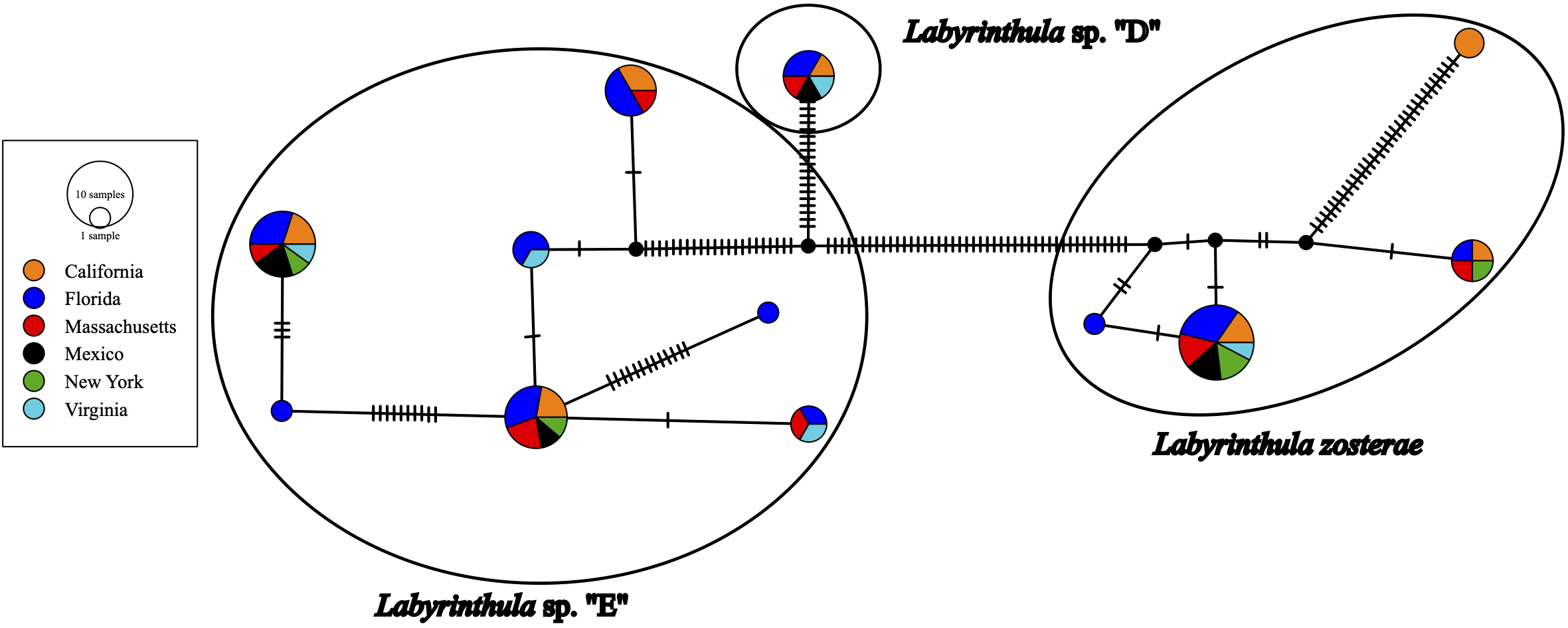 Network analysis for Labyrinthula ASVs generated with the PopArt software using sequences generated in this study. Colors indicate locations. Each cross-bar indicates a single nucleotide polymorphism or gap. The proportion of color in pie charts with >1 sequence indicates the proportion of unique sequences.