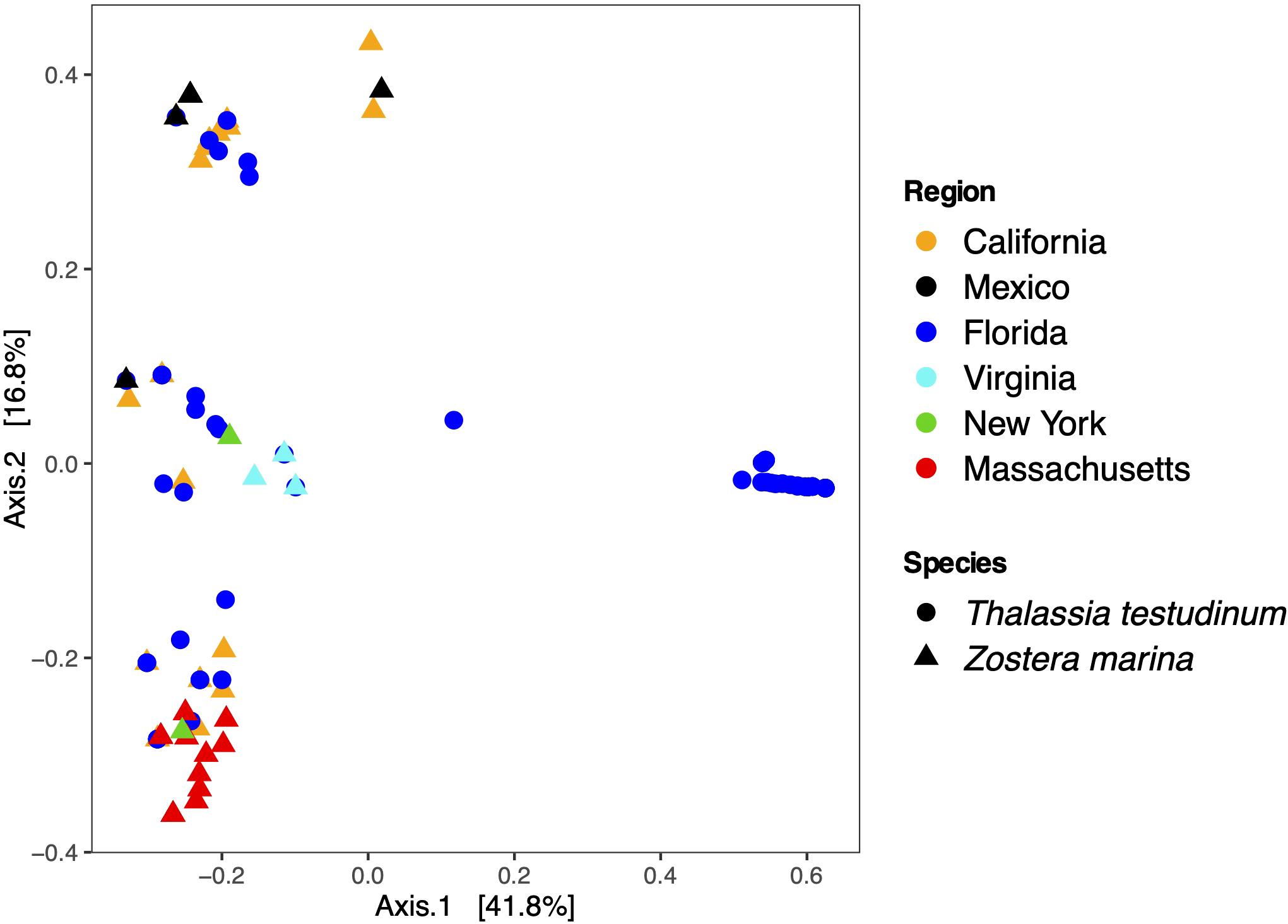 Principal Coordinate Analysis (PCoA) of Labyrinthula communities recovered from seagrass blades. The regions from which the ASVs were detected are noted by color while the seagrass hosts collected are distinguished by shape.