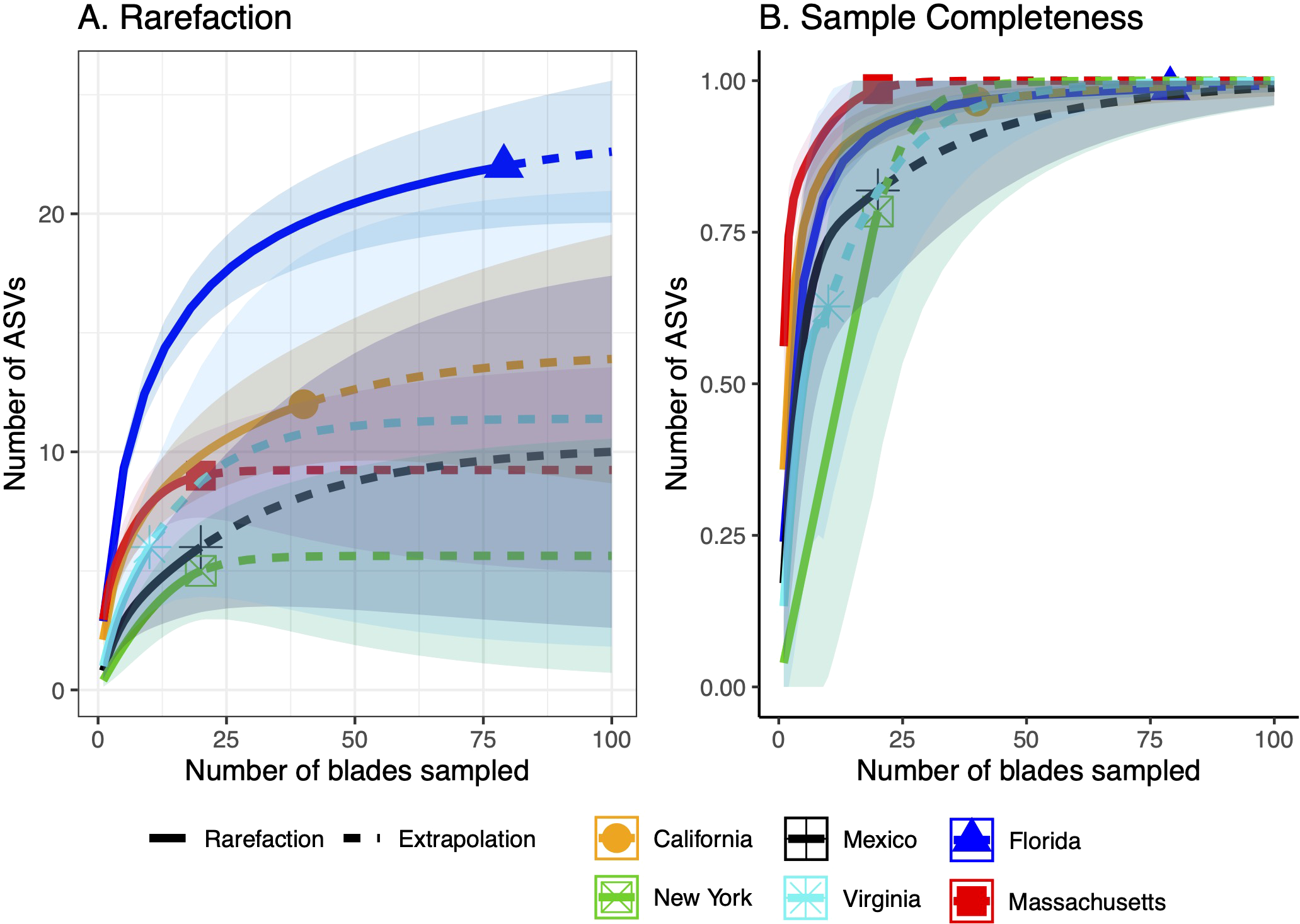 Rarefaction (A) and sample completeness (B) curves with extrapolation (dashed lines) to assess the number of ASVs detected and predicted based on the number of seagrass blades sampled. The color surrounding the lines is the 95% standard error.