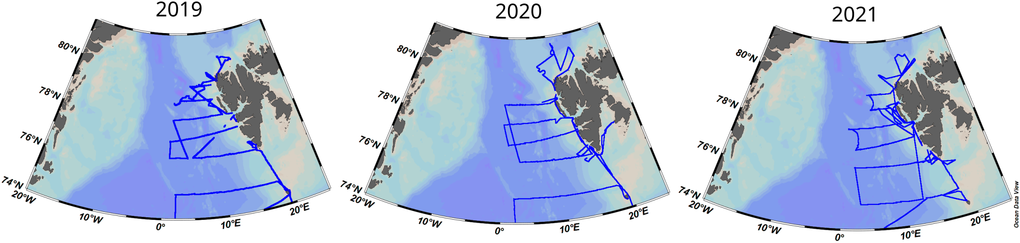 During 2019 and 2021, salinity and temperature were continuously measured in the flow of surface water using an SBE 21 SeaCAT thermosalinograph (SeaBird) installed on board and equipped with an additional temperature sensor SBE38 located at the water inlet, both sensors were calibrated in every cruise shortly before starting it. The temperature accuracy was ± 0.01°C in both instruments and the initial accuracy conductivity of the SBE 21 SeaCAT-thermosalinograph was ± 0.001 S/m. In 2020, the surface salinity and temperature data were derived from CTD casts taken with the SBE9/11+ system (SeaBird) installed on a water carousel, which was calibrated shortly before the beginning of the cruise with a temperature (conductivity) accuracy of 0.01°C (± 0.001 S/m). All data was averaged using the same grid resolution as explained in section 2.1.