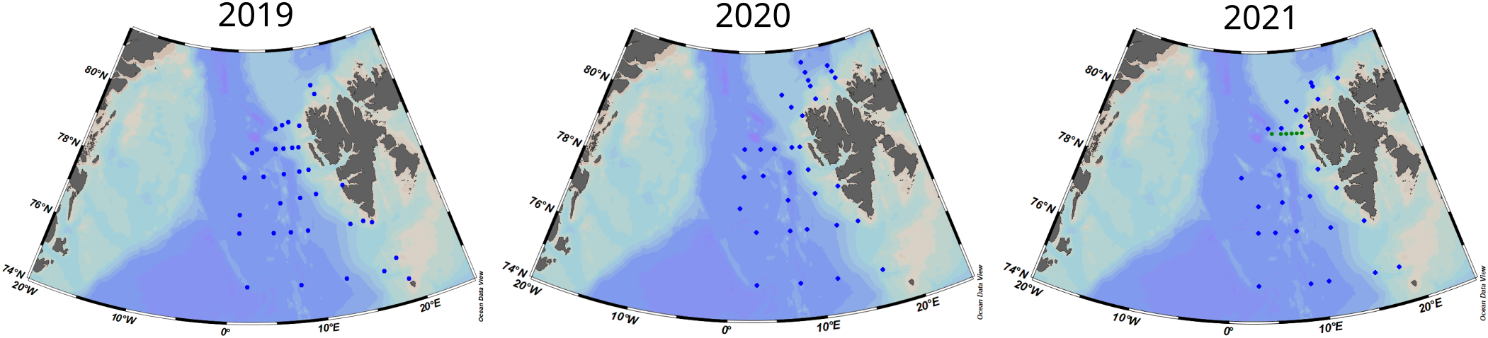 Study area with the location of the TA and DIC sampling locations (blue dots) during 2019, 2020 and 2021. The green dots in 2021 (right) show the location of the water column profiles extracted from the “CarbonBridge productivity regimes in the Arctic Ocean” project dataset (Paulsen et al., 2017) collected in January 2014. Figure created with Ocean Data View (Schlitzer, 2023).