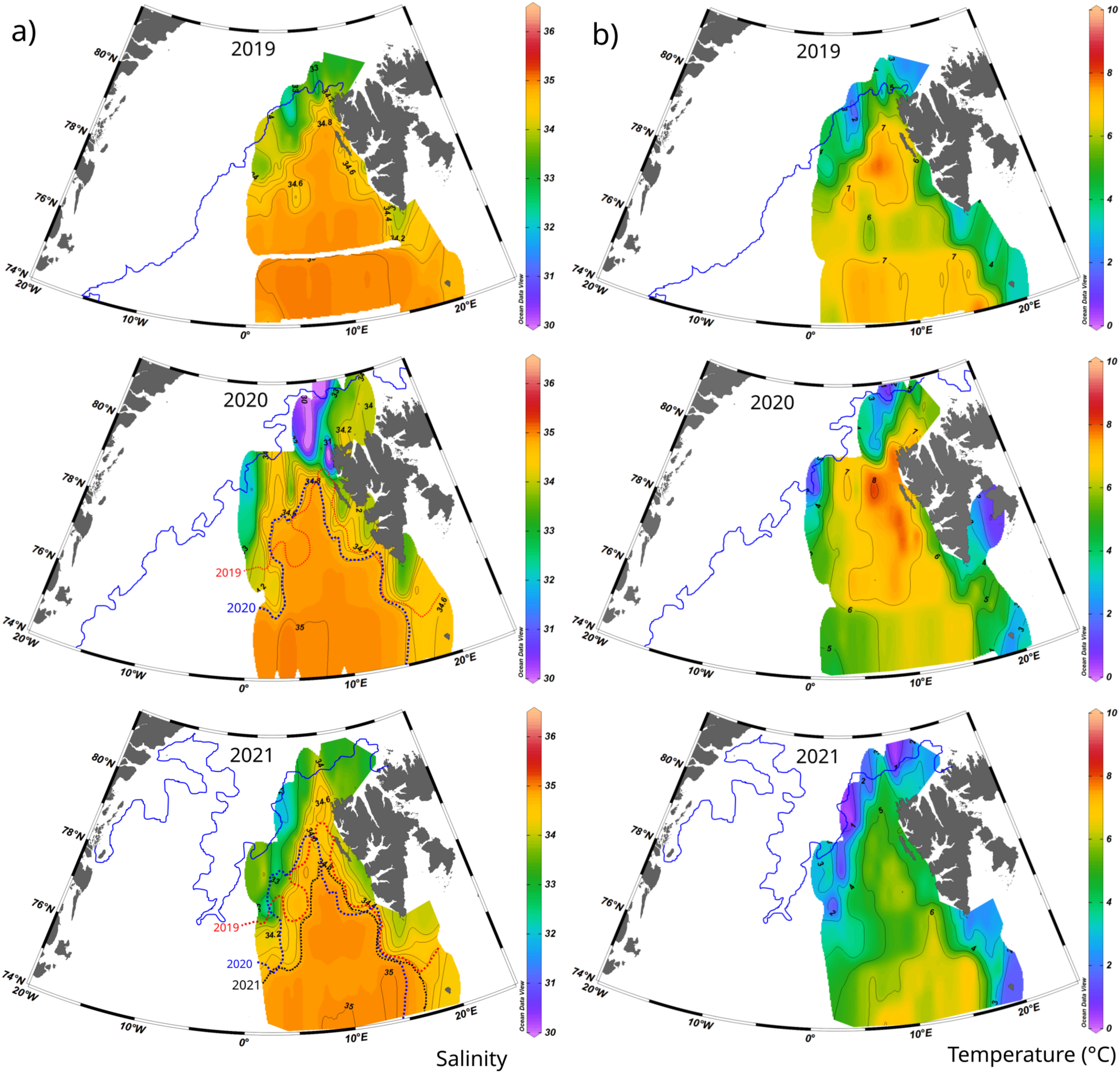 Unlike the salinity distribution, the surface temperatures show a strong interannual variability (Figure 3B). A strong temperature gradient was observed in all studied years close to the sea-ice margin in the west/northwest part of the study area, with warmer waters following the direction of the WSC from the south and reaching up to 79°N. Still, the spatially averaged surface temperature (calculated as the average of the gridded data, with the same spatial distribution and the same extension between years, see methods) differed from one year to another, amounting to 5.2°C during 2019, 5.3°C in 2020, and 3.8°C in 2021. The spatial patterns of the temperature gradients also varied between different years. One of the main features that could be distinguished is a zonally extending pattern of lower surface temperature located at 76°N in 2019, at 75°N in 2020, and at 76°N in 2021 (Figure 3B). An explanation of causal mechanisms, responsible for complex and annually varying patterns of surface temperature is beyond this study. However, the average surface temperature clearly shows colder surface waters during 2021 than during 2019 and 2020, coinciding with a smaller extension of the AW surface pattern (defined as surface waters with S > 34.8) and reduced sea ice.