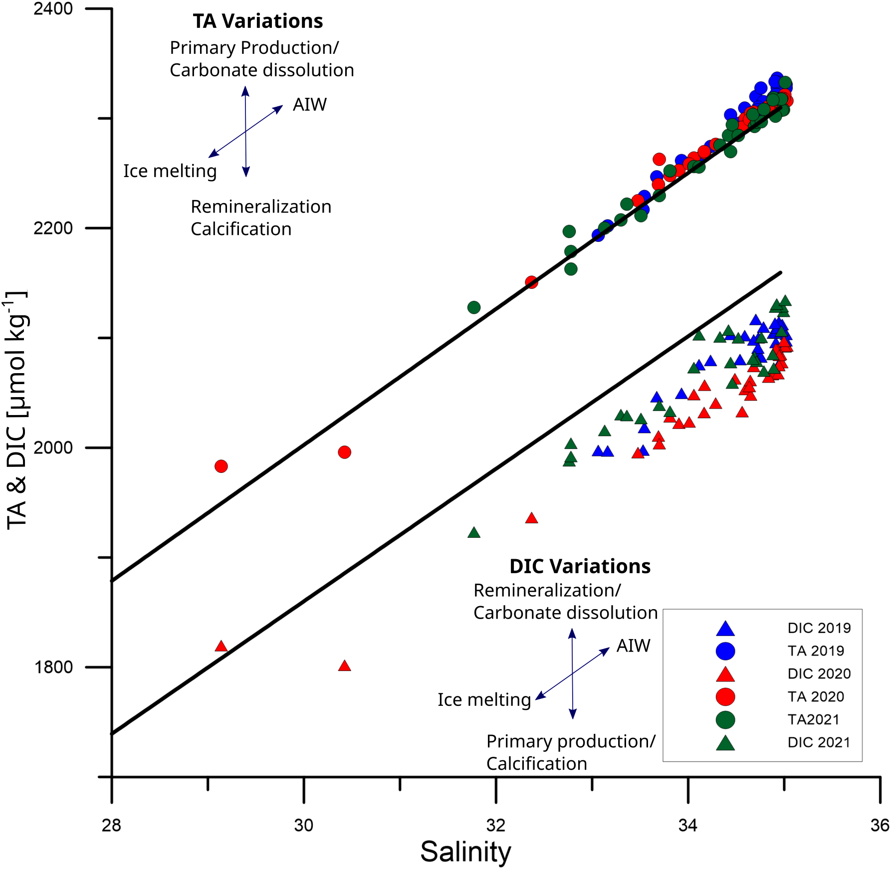 The data collected for TA and DIC from 2019 to 2021 are shown in Figure 5. The main changes in TA are closely correlated as a function of salinity. TA data shows a conservative mixing along the line drawn between the AW properties reported for winter (salinity 34.96 and TA = 2310 µmol kg-1, Table 1) and the TA of the melted sea ice (salinity 5.0 and 441 µmol kg-1 TA) (see methods for details and references) revealing high variability, but similar to previously reported in the area (Chierici et al., 2019; Tynan et al., 2016). Tynan et al. (2016) were able to characterize two TA0 zero salinity end-members, one lower (TA0 = 403 µmol kg-1) associated with sea ice melting and one higher (TA0 = 1230 µmol kg-1) related to the influence of Polar Waters. However, our data only shows the influence of one TA0 with low values (∼ 420 µmol kg-1), supporting the idea that TA variations in this data set result only from the mixing between AW and sea ice meltwater.