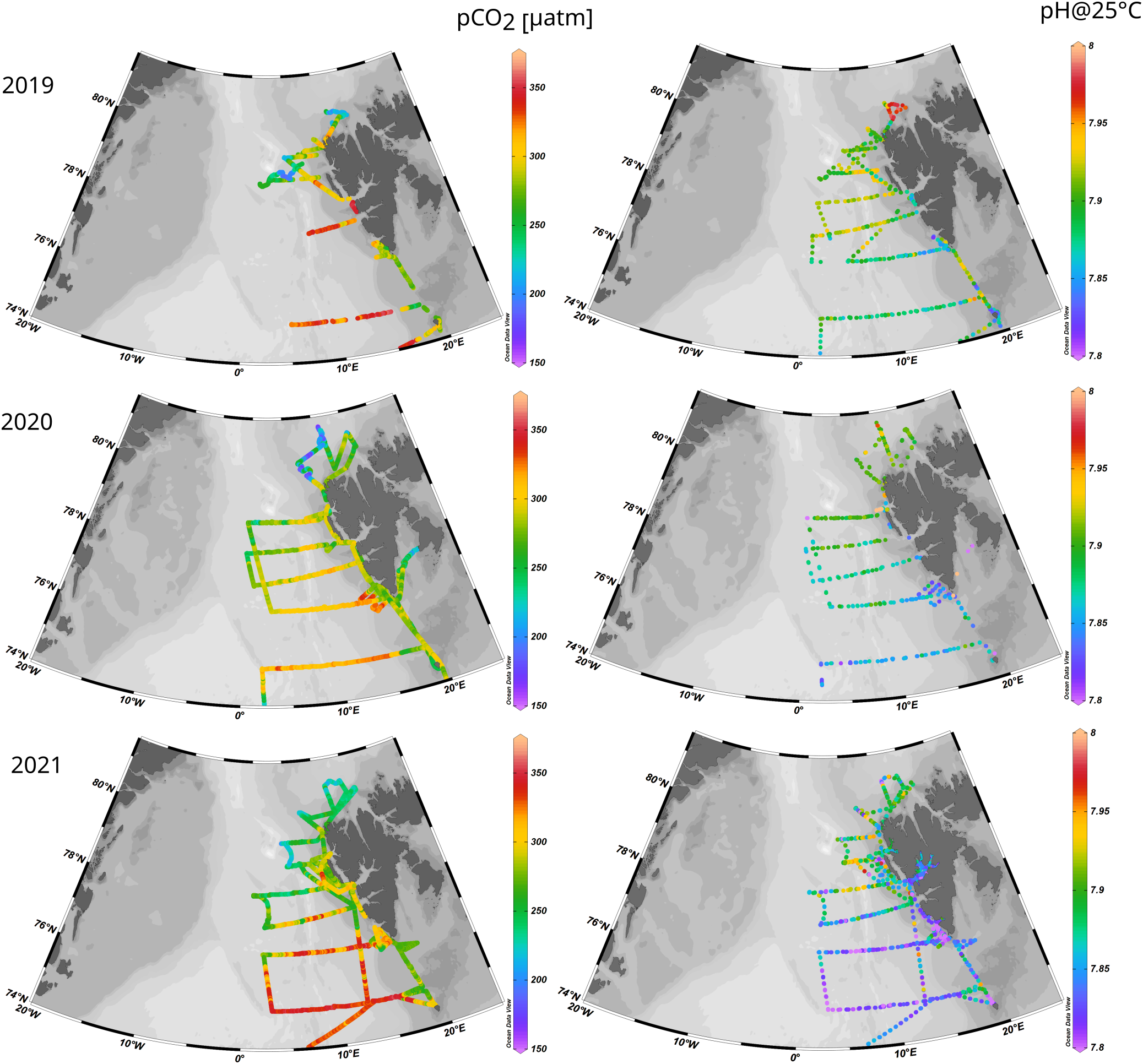 The changes in DIC and TA presented in this section are strongly connected to changes in pCO2 and pH. Both of them play a key role as indicators of atmospheric carbon sequestration and ocean acidification. Due to the sampling strategy, pH and pCO2 data were collected in higher resolution, providing not only information about their general distribution but also about mesoscale processes which could influence their variability.