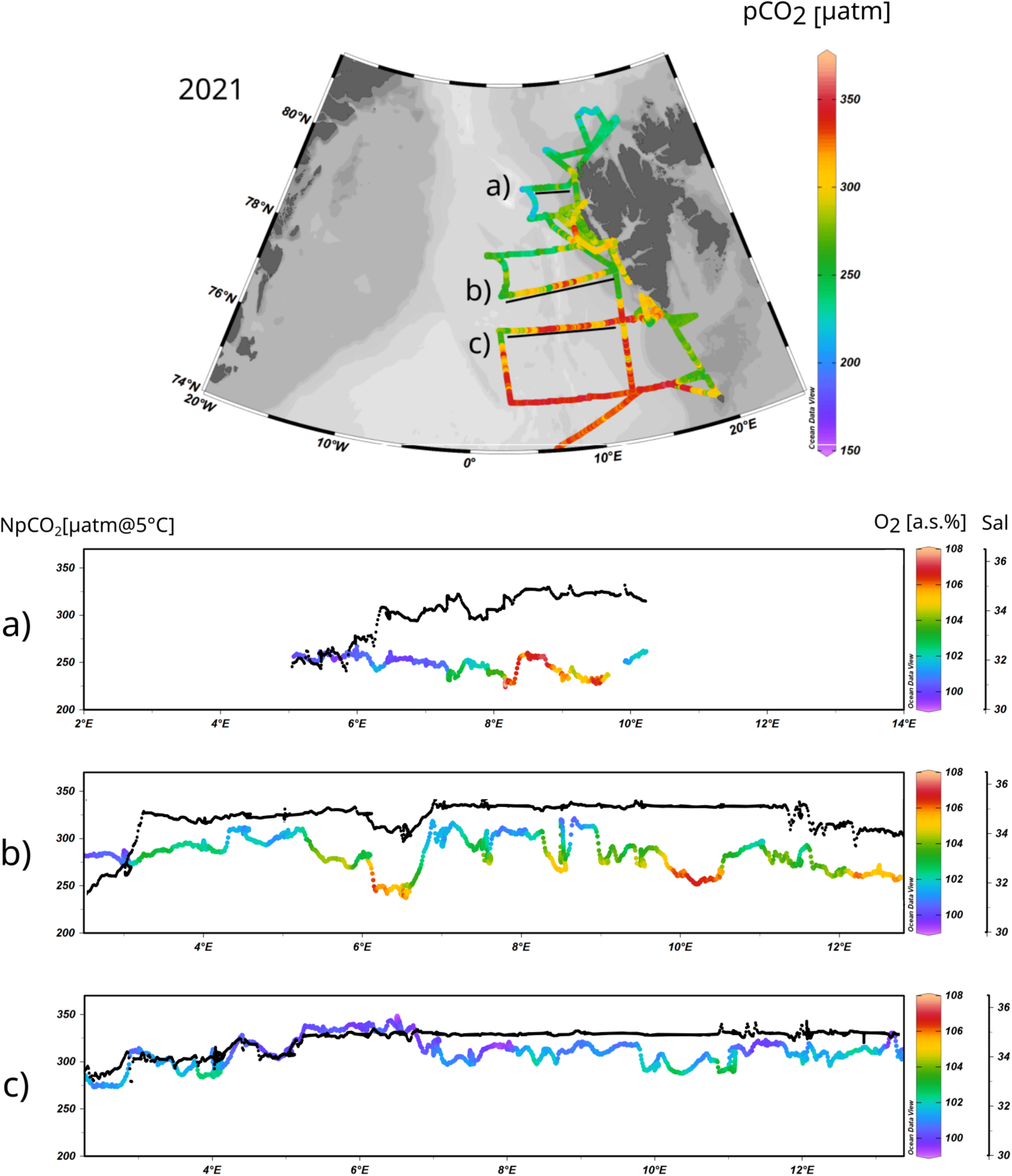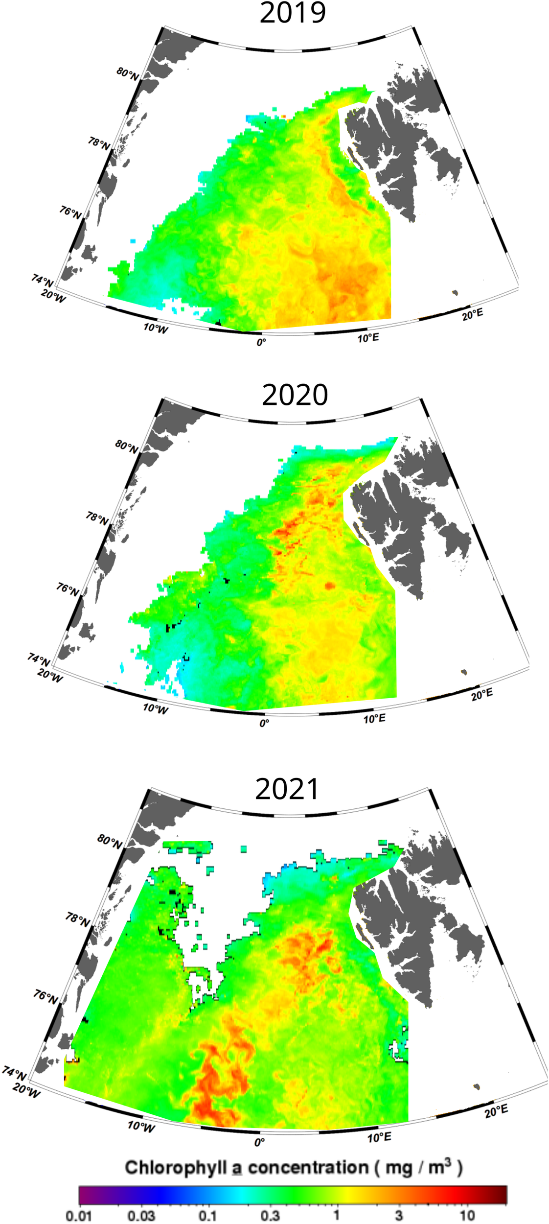 One of the most biologically productive sectors in the Arctic region is the Fram Strait area (Pabi et al., 2008; Slagstad et al., 2015). Being also the main gateway for sea ice export from the Arctic (e.g., Spreen et al., 2020), it provides a unique setting to study the influence of the changes in the cryosphere and the biological processes on the variability of the marine carbonate system in the surface waters. Furthermore, it was already reported that factors controlling changes in Fram Strait NPP are potentially associated with variations in ice-free zones during the growing season (Kahru et al., 2011; Arrigo and van Dijken, 2015), intensification of the water column stratification due to increased ice melting (Mayot et al., 2020), rising sea surface temperature (SST) (Cherkasheva et al., 2014), increase in nutrients availability (Krisch et al., 2020; Tuerena et al., 2021), and changes in the dynamics of the water masses (Arrigo et al., 2017; Joli et al., 2018; Marchese et al., 2019).