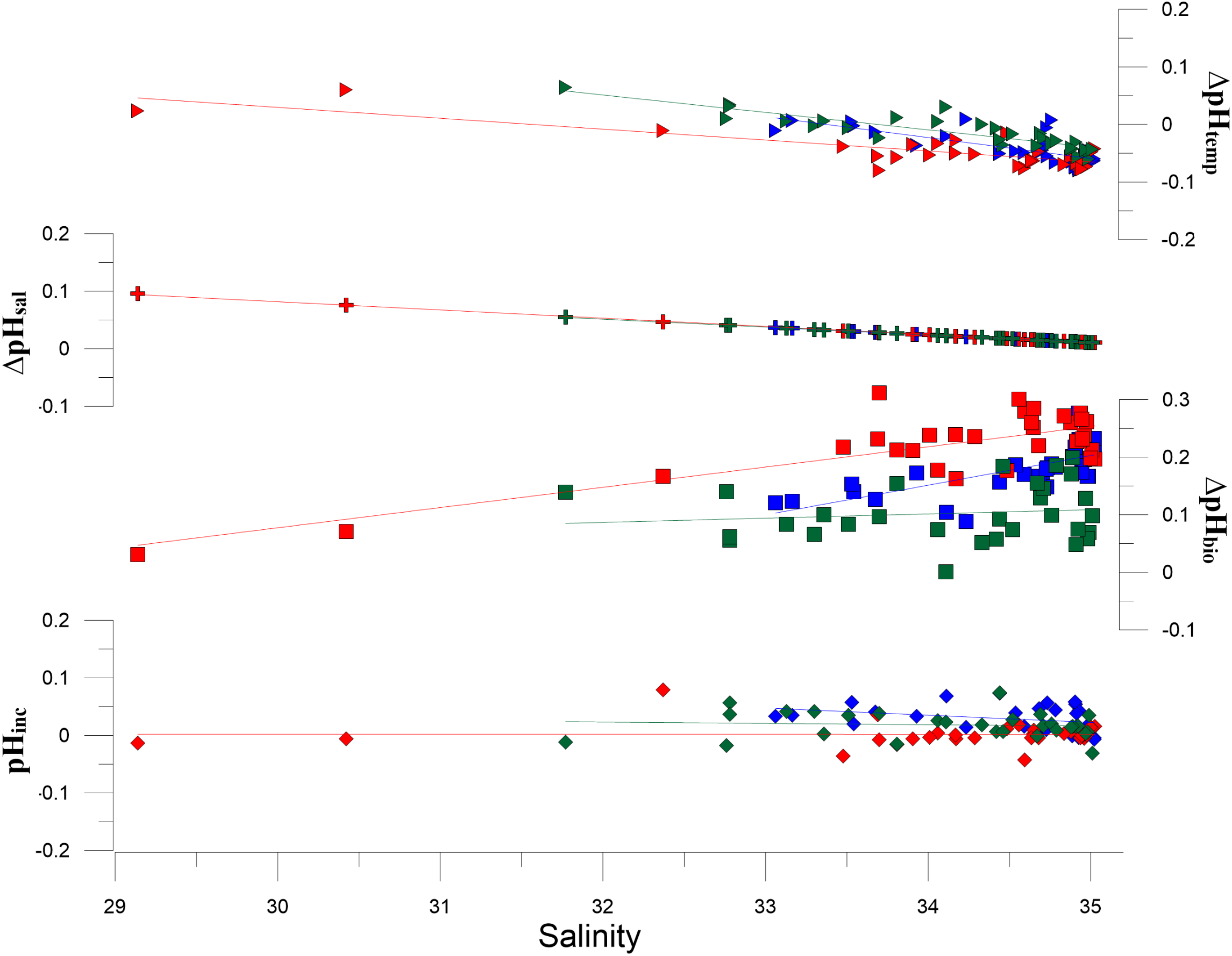 The difference between TA and DIC measured in the consecutive summers (TAmeas, DICmeas) and TAsal and DICsal (Equations 1, 2) resulting from the physical mixing of water masses (or the influence of sea ice melting) can be attributed to the total effect of both biological processes (photosynthesis/respiration and calcification) and sea-air CO2 exchange. Thus, the accumulated pH change corresponding to these effects (ΔpHbio) can be calculated as: