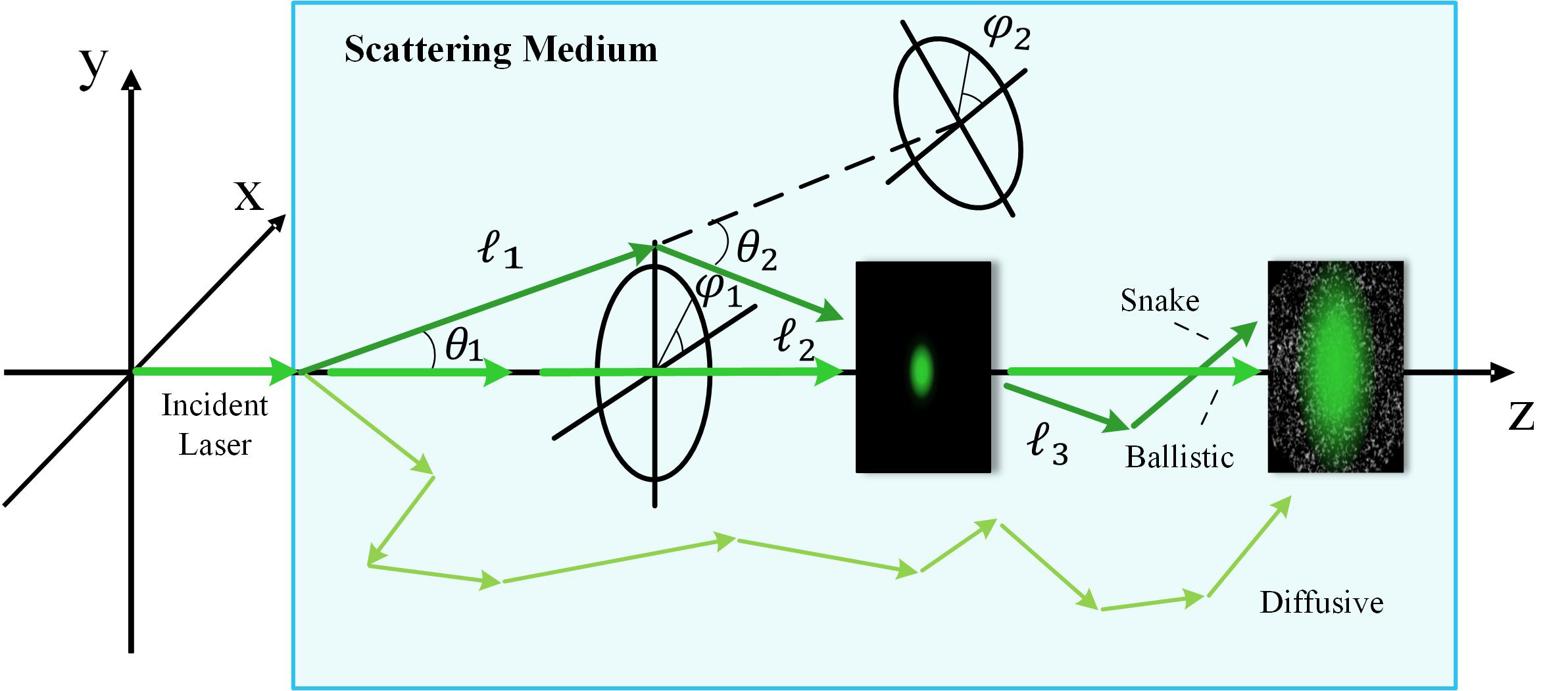 Schematic of laser propagation in a scattering medium showing the ballistic, snake, and diffusive photons. As the Gaussian beam propagates through the scattering medium, the divergence angle of the beam becomes larger and resolution is reduced with random noise.