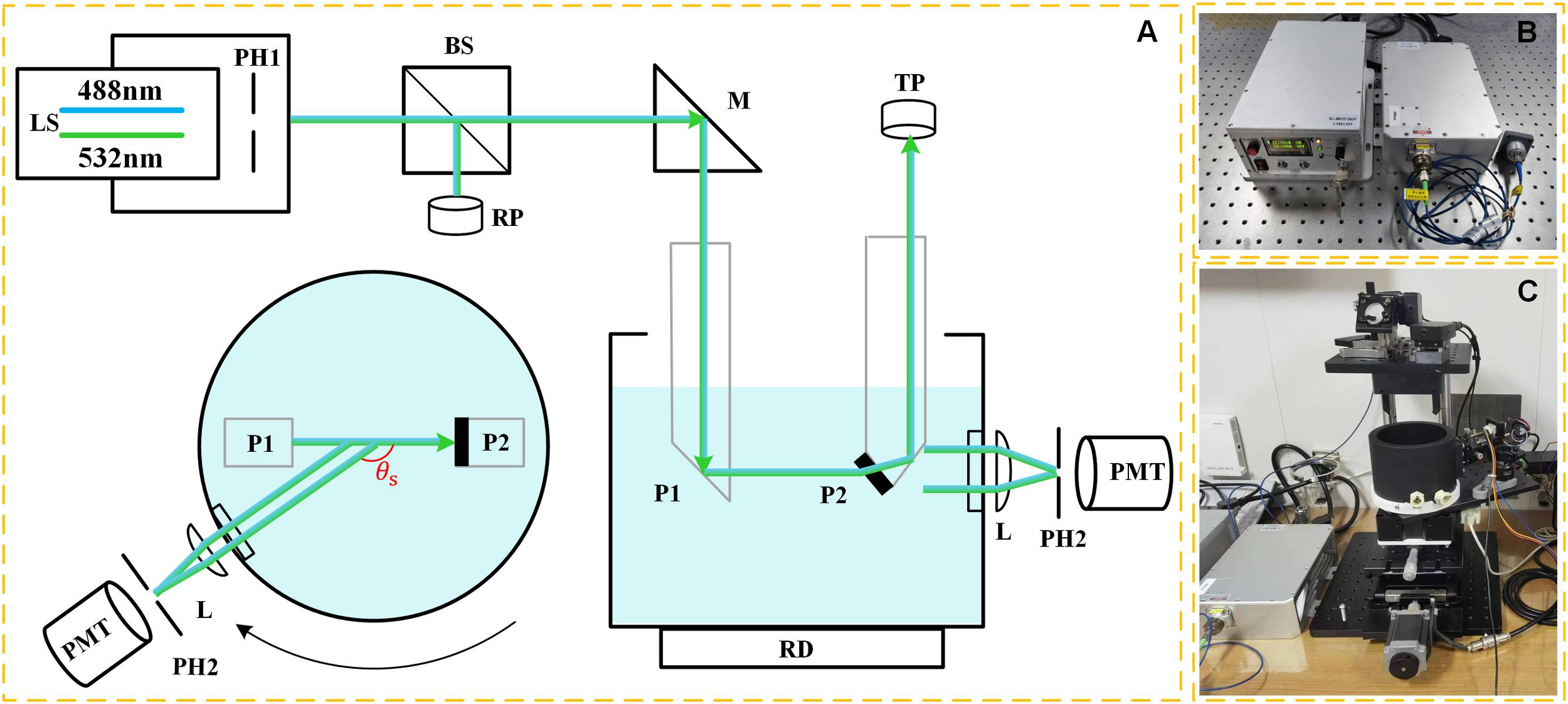 The schematic of the dual-wavelength VSFLab. (A) Layout and measurement principle, including laser source (LS), pinhole 1 (PH1), beam splitter (BS), reference photodetector (RP), mirror (M), prism 1 (P1), basin, prism 2 (P2), transmittance photodetector (TP), lens (L), pinhole 2 (PH2) and photomultiplier tube (PMT). The mirror (M), incident prism 1 (P1), and exit prism (P2) form a periscope-optical structure; top view of the measurement system is displayed on the left. The scattered light detecting system is composed of L, PH2, and PMT; (B) View of dual-wavelength laser system. (C) Photograph of the laboratory installation of dual-wavelength VSFLab.