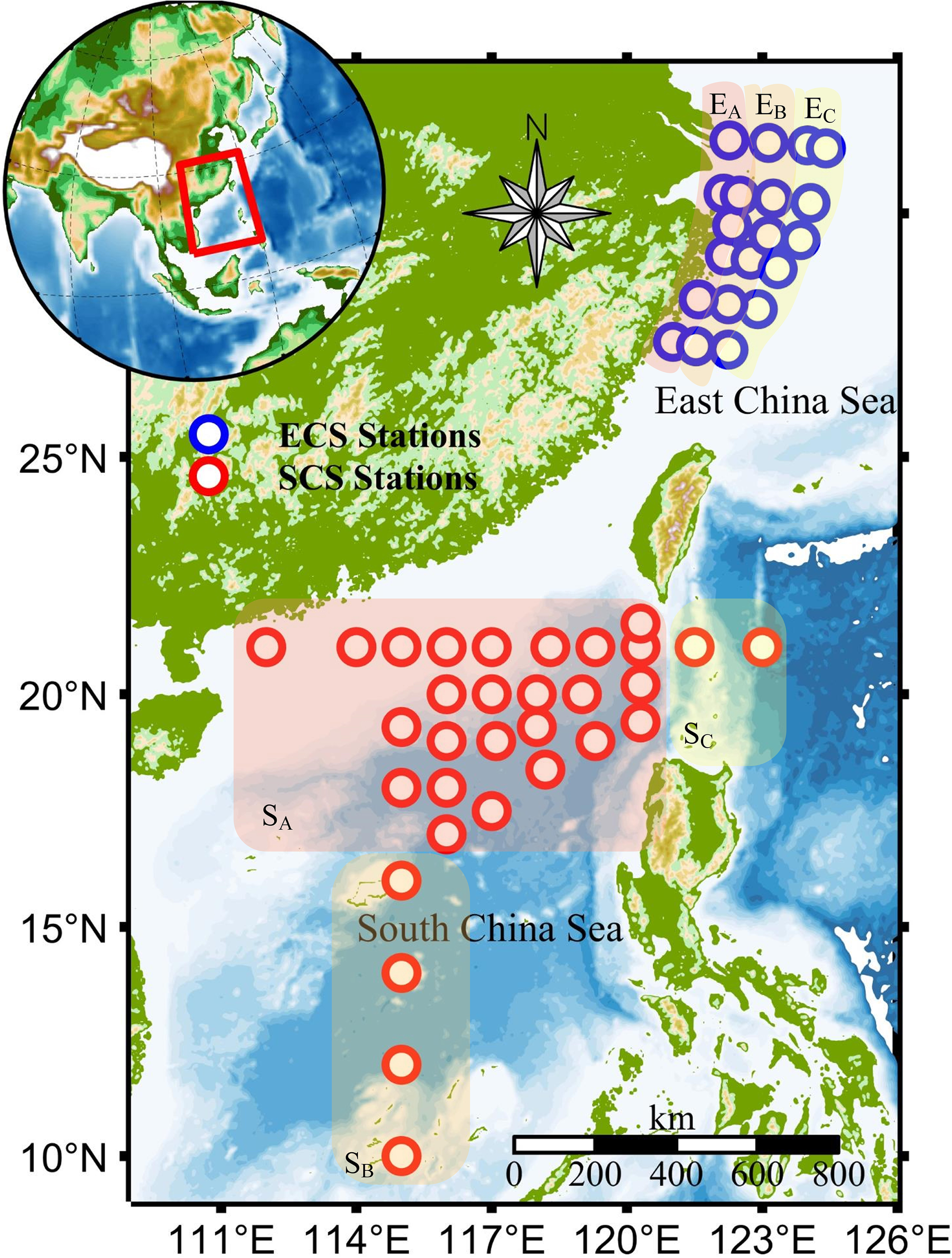 Locations of the stations of NORC cruise (red circles) in South China Sea and ShenLan cruise (blue circles) in East China Sea. The background is the bathymetry of the study area.