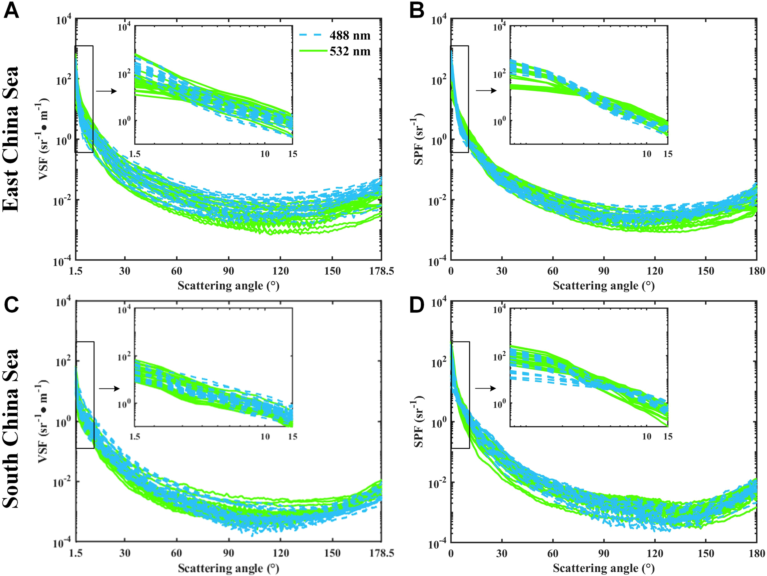 Figures 5A, C present the experimental results for the VSFs in the ECS and SCS, respectively. It is clear that the lowest value of the VSFs in the SCS could reach 10−4, whereas that in the ECS was 10−3, which indicates that in SCS is comparatively lower than that in the ECS. Furthermore, when considering the forward VSF, ECS demonstrated a more pronounced scattering effect than SCS. This observation implies that the particle sizes prevalent in the ECS are larger on average than those found in the SCS (Zhang et al., 2011). The intensity of the backward VSFs observed in the ECS measurements was significantly lower than that in the forward region. In experimental stations rich in minerals or inorganic particles, the difference can be as low as nearly four orders of magnitude. However, at the stations further away from the shore ( area), the differences can extend to five orders of magnitude. In the SCS, the difference was even greater and reached six orders of magnitude. High-angle-resolution SPF demonstrates distinct responses to the characteristics of various types of particles (Zugger et al., 2008). The full-angle SPFs derived from the VSFs measured in the SCS and ECS are shown in Figures 5B, D, respectively. In the ECS, there are differences in the SPFs between 0° and 30°for 488 nm and 532 nm, where the descending slope of 488 nm is notably steeper than that of 532 nm, which deviates from the observations in the other regions within the ECS. From 30° to 90°, no significant difference was observed in the SPF between the two wavelengths. However, within the angular range of 30° to 90°, a significant difference in the SPF shapes at different wavelengths becomes apparent. In the SCS, the shapes of the SPFs for the dual-wavelength are similar in the forward region (0°-60°). The rate of change for 488 nm is greater than that for 532 nm from 60° to 150°. Beyond 150°, both wavelengths exhibit an increasing trend, with the slope at 488 nm being higher than that at 532 nm. It is clear that 532 nm exhibits a greater slope before 30° than 488 nm, indicating stronger forward scattering.