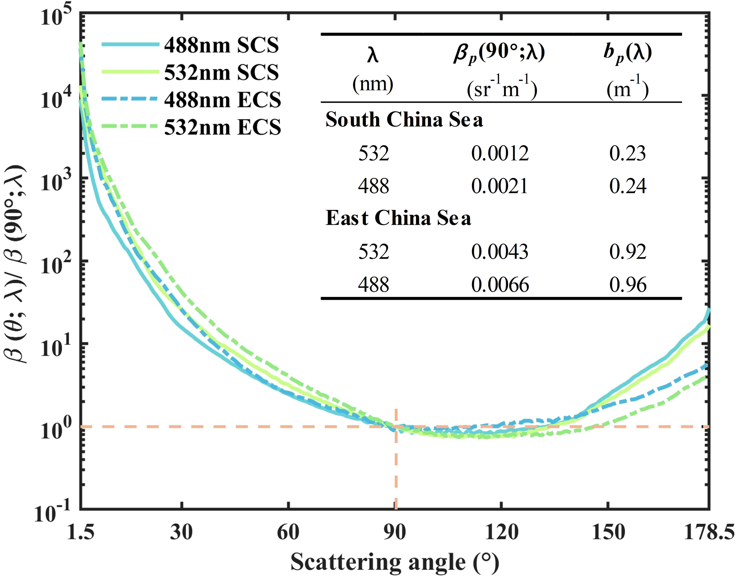 Wavelength dependence of VSFs measured in clear (SCS) and turbid (ECS) waters. The four lines represent the mean value of the measured VSFs at 488 nm and 532 nm. The table shows the values of λ) and λ) in SCS and ECS at different wavelengths. The intersection between the dotted orange lines marks the normalized position.