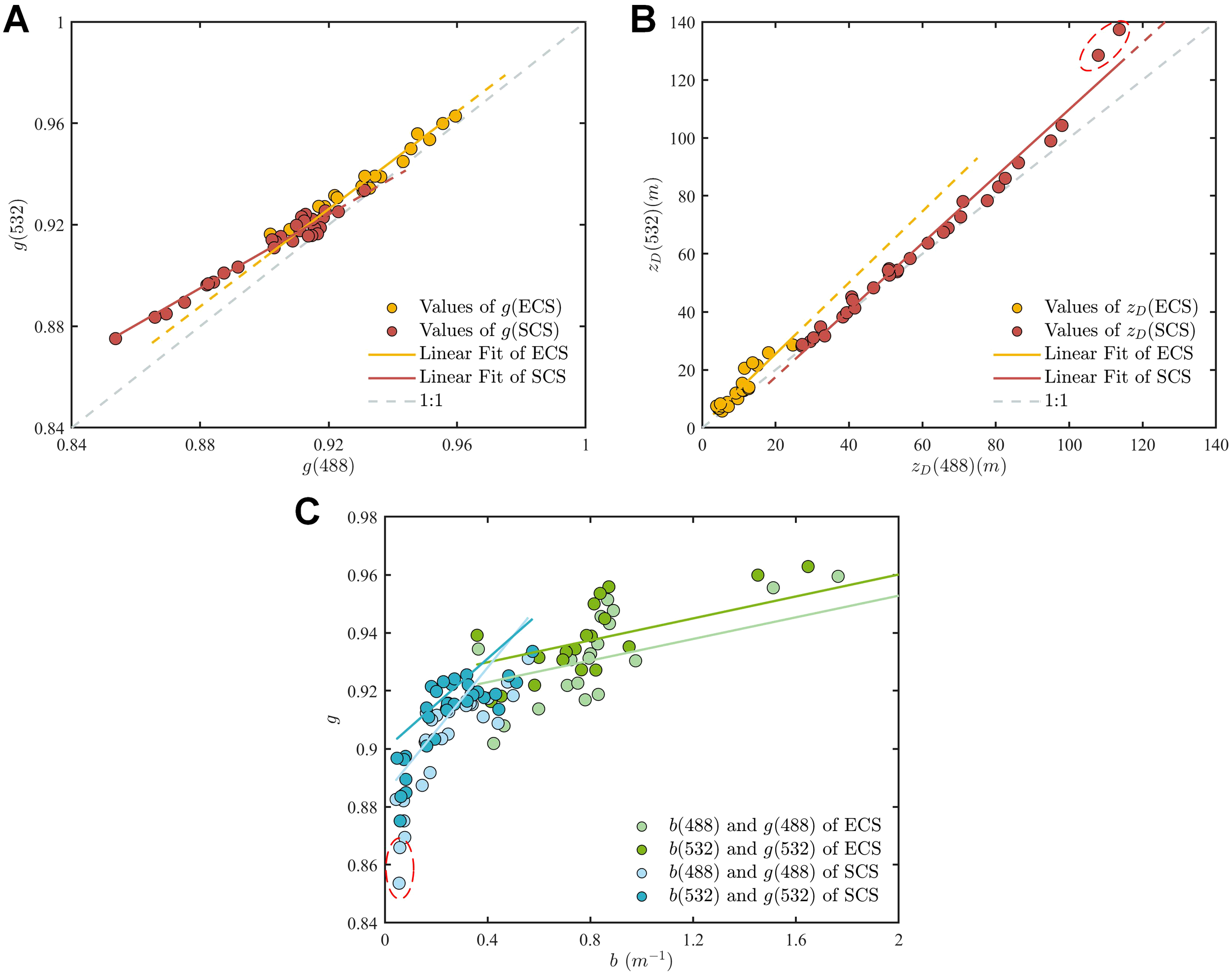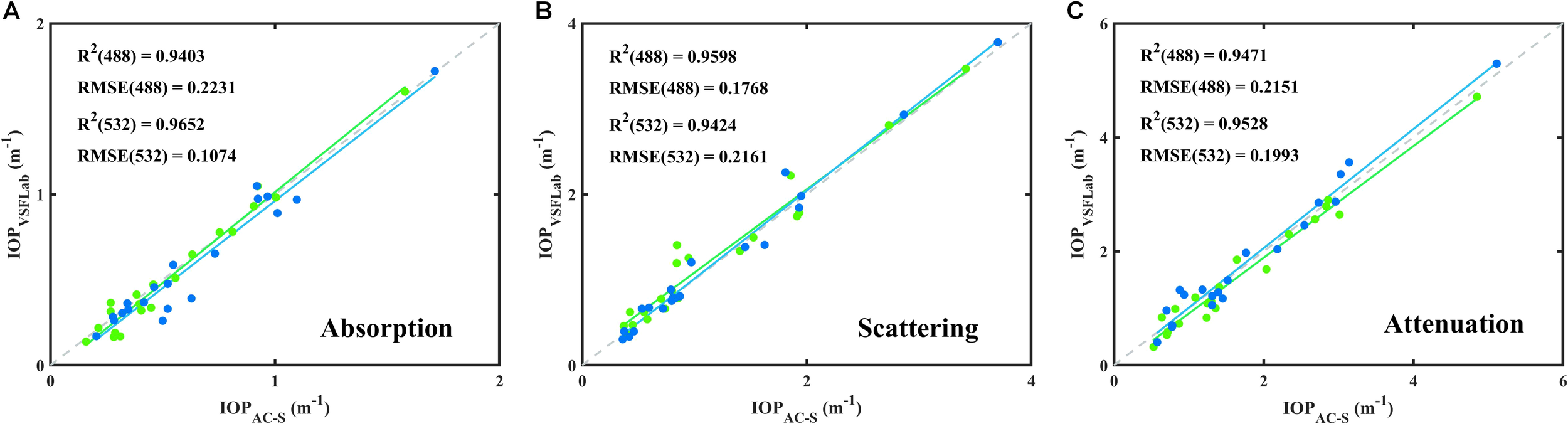 Relationship between (A)(λ), (B)(λ) and (C)(λ) measured by dual-wavelength VSFLab and AC-S. The scattered blue points represent the values obtained at 488 nm, and the green points represent those measured at 532 nm. The solid blue line corresponds to the linear fit between the dual-wavelength VSFLab and AC-S measurements at 488 nm. The solid green line is the fitting line corresponding to the measurements at 532 nm. The dotted gray lines represent the 1:1 lines.