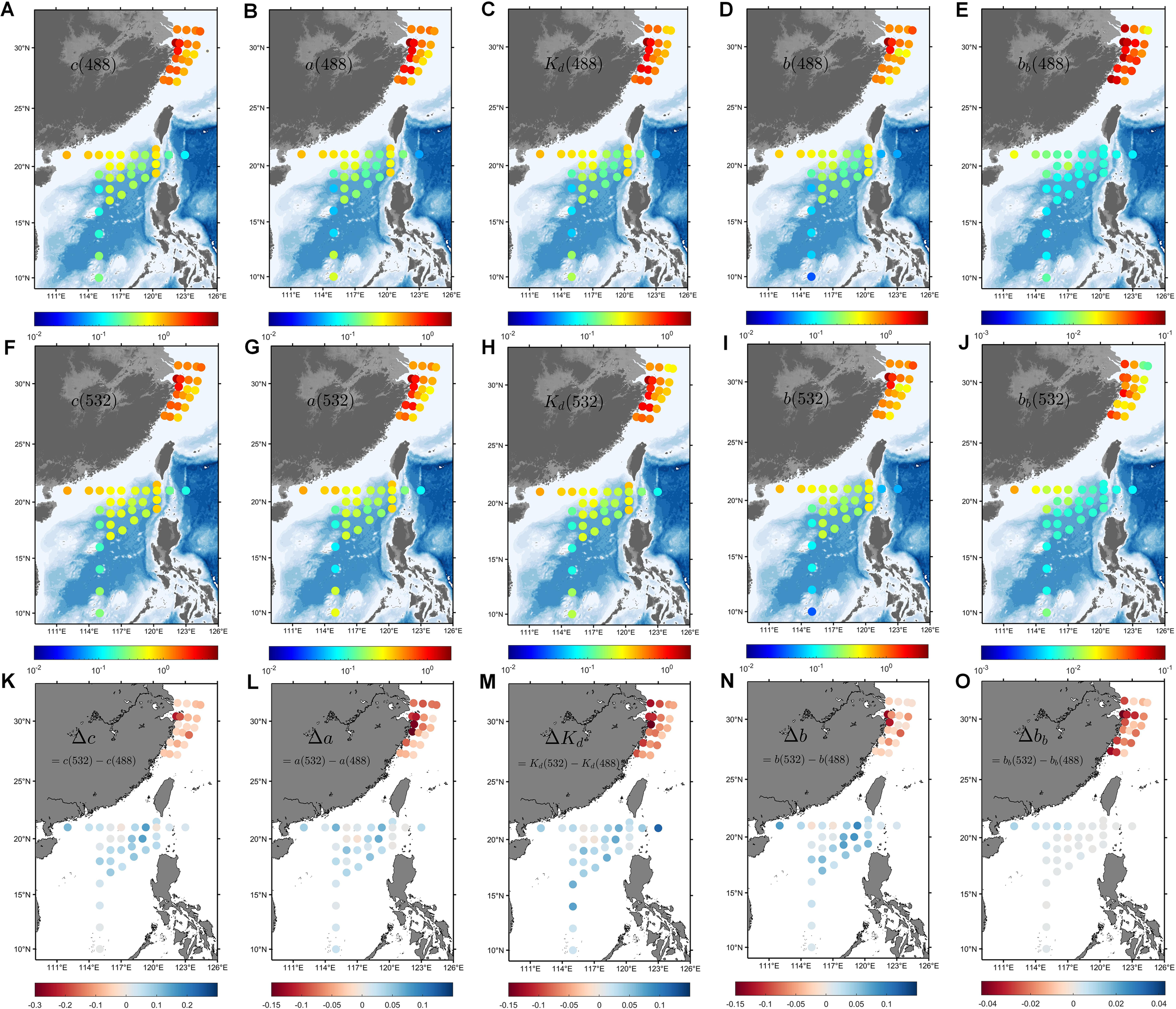 Distribution of common optical properties (OPs, including c, a, , b, and ) in the ECS and SCS. The first row (A–E) represents the OPs at 488 nm, the second row (F–J) represents those at 532 nm, and the third row (K–O) represents the difference between the two wavelengths, Δ(OPs) = OPs(532) − OPs(488).