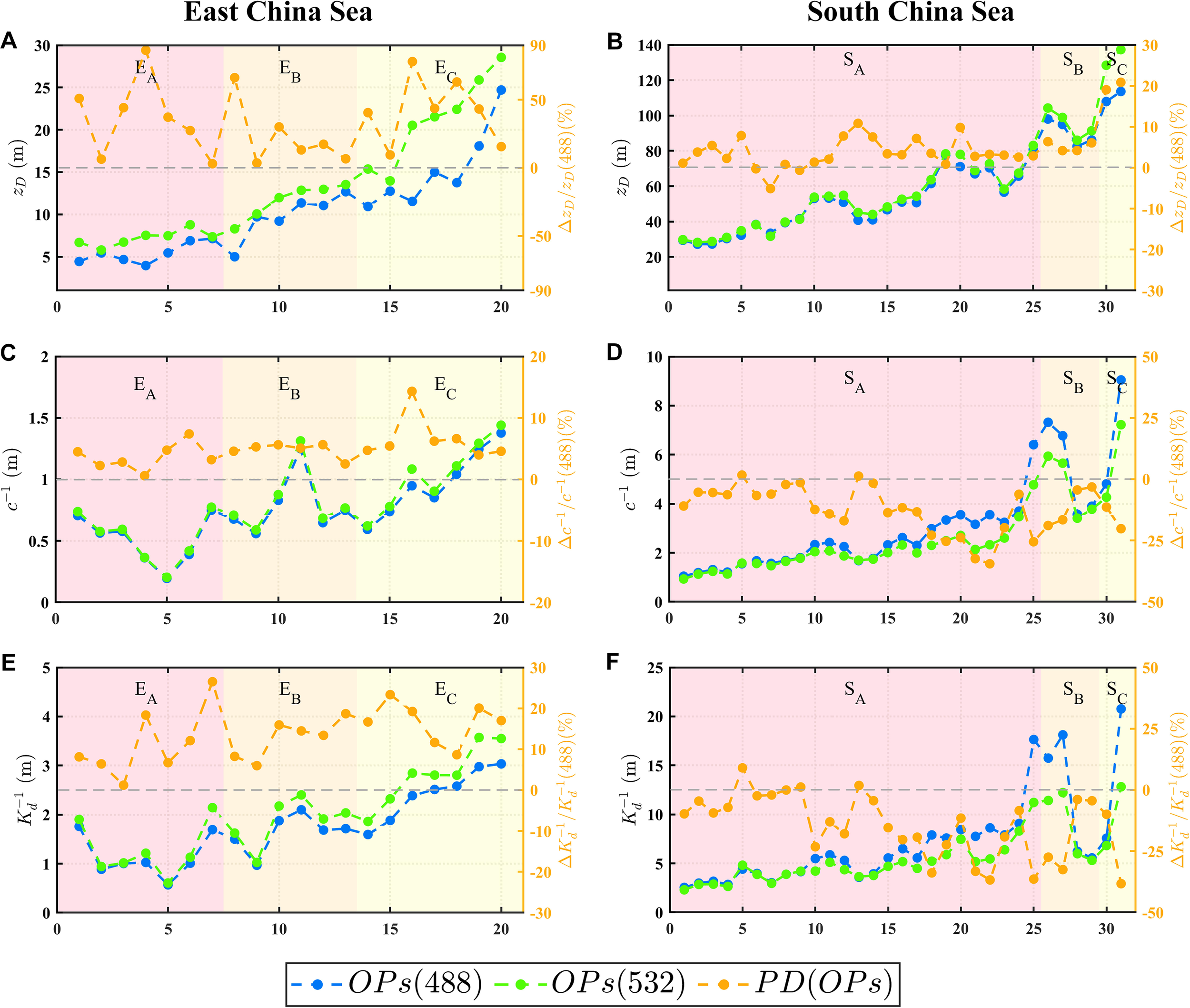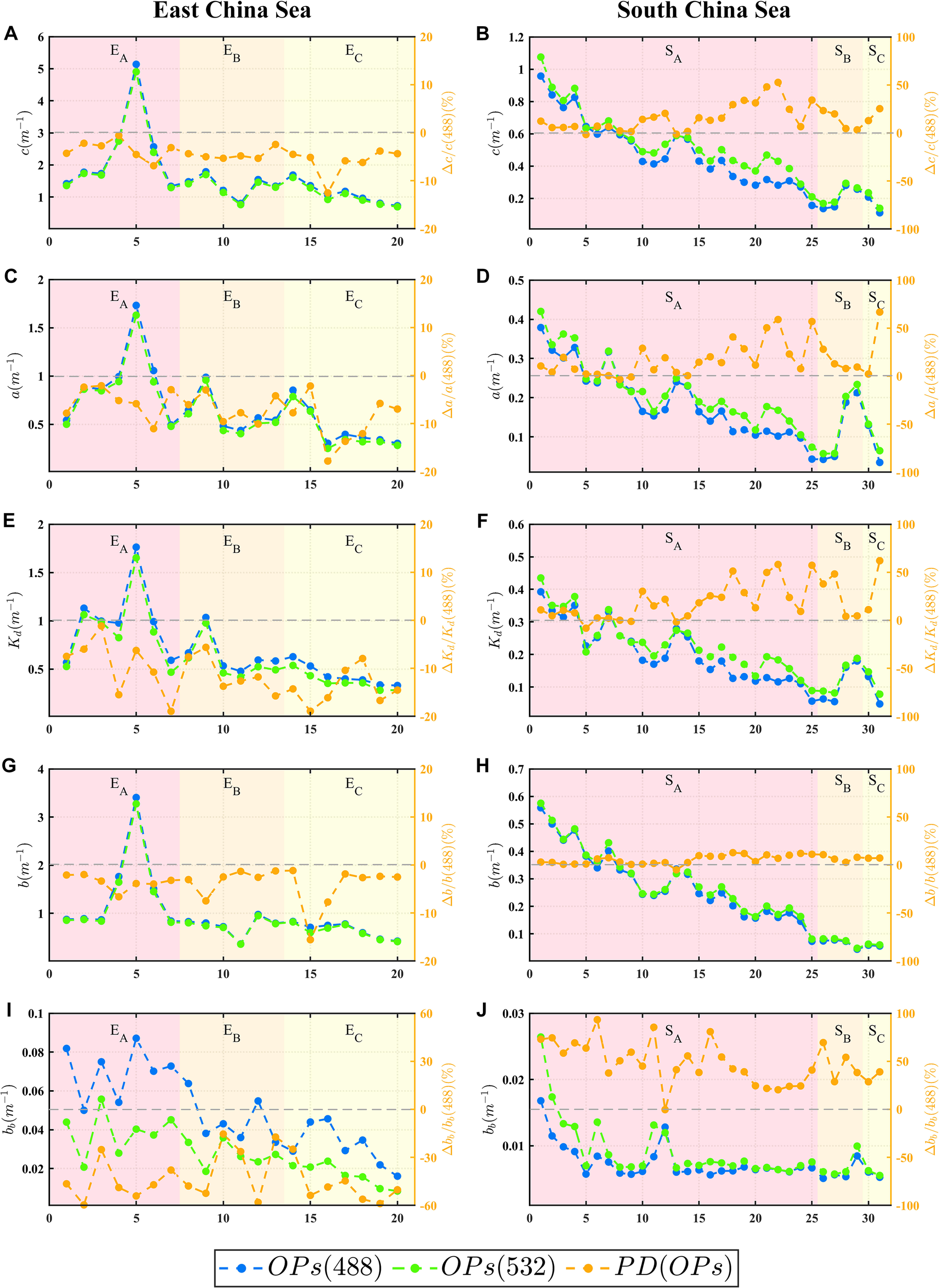 Comparison of OPs between 488 nm and 532 nm in the ECS and SCS , where c corresponds to (A, B), a to (C, D), Kd to (E, F), b to (G, H) and bb to (I, J). Blue and green lines represent the OPs at 488 nm and 532 nm, respectively. The orange lines represent the percentage difference (PD(OPs)) in different areas of the ECS and SCS, respectively. Note that PD(OPs) = 100 ∗ Δ(OPs)/OPs(488).