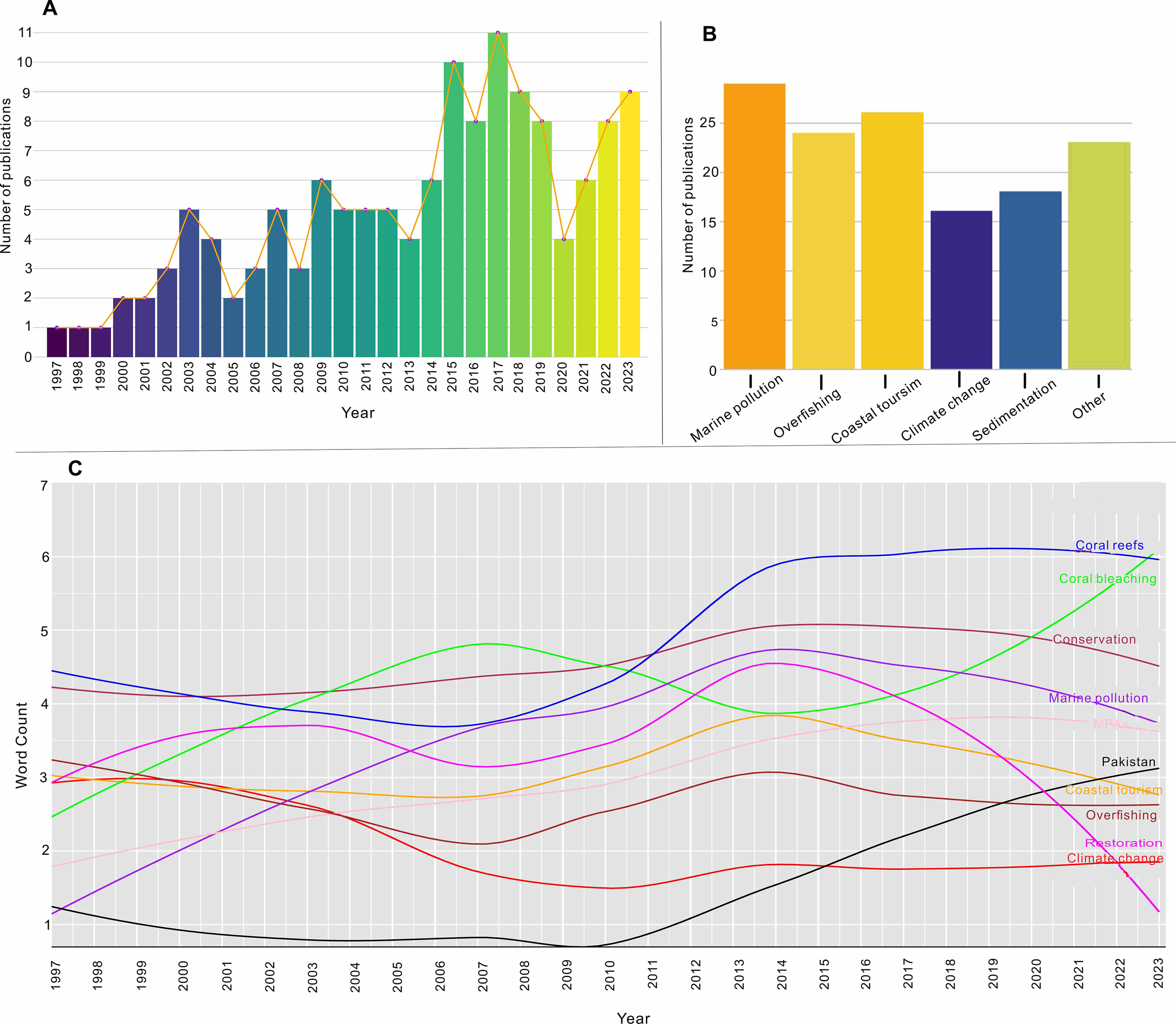 The literature for this study was compiled primarily from online databases and search engines, including Google Scholar (https://scholar.google.com/), Web of Science (https://www.webofknowledge.com/), PubMed (https://pubmed.ncbi.nlm.nih.gov/) and Science Direct (sciencedirect.com). Keywords such as “coral reefs,” “Pakistan,” “anthropogenic threats,” “climate change,” “ocean acidification,” “overfishing,” “coastal tourism,” eutrophication,” “marine pollution,” “coral bleaching,” “MPAs,” “restoration,” “conservation,” “estuaries,” and “coastal water ecosystem” were used for the search. Relevant journals in the fields of geology, marine geology, biology, marine biology, and environmental sciences were also consulted. Results from these libraries were imported to R (R Core Team, 2022) and subjected to analysis using the Bibliometrix package (Aria and Cuccurullo, 2017). A total of 136 scientific articles published between 1997 and 2023 were collected for our analysis and discussion on the coral reef ecosystems in Pakistan. The trend depicted in (Figure 2A) indicates a consistent annual increase in the number of published articles every year. Based on specific anthropogenic threats we describe in this paper, most of the research focuses on marine pollution as their primary parameter to measure (29%), followed by overfishing (24%), coastal tourism (26%), sedimentation (18%), climate change (16%) and other related papers (23%) (Figure 2B). Additionally, we found that specific author keywords tended to occur more frequently during a certain period. Figure 2C shows the yearly occurrences of the main terms from 1997 to 2023, but some of them increased more dynamically compared than others. The terms with the greatest increase in use over time were ‘coral reefs’, ‘coral bleaching’, ‘marine pollution’, ‘MPAs’, ‘overfishing’, ‘coastal tourism’, ‘climate change’, ‘Pakistan’, ‘conservation’, and ‘restoration. Also, an extensive review of international, federal and provincial policy documents was carried out to identify those relevant to coral reef or coastal ecosystem conservation or restoration (see Table 1).