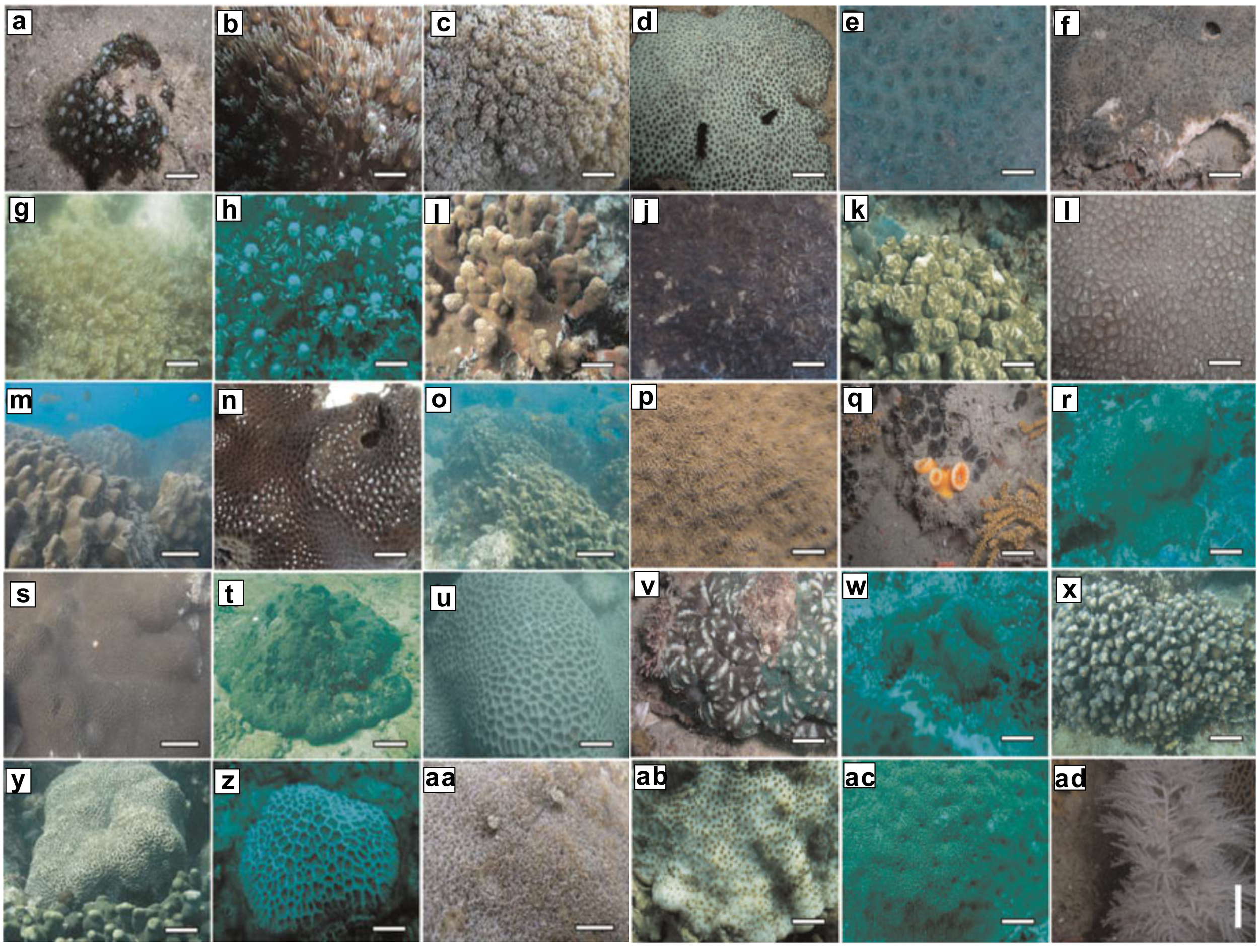Hard coral species diversity in Pakistan coastal waters [modified after Ali et al. (2014)]: (A)Goniopora albiconus; (B)Goniopora columna; (C)Goniopora djiboutiensis; (D)Goniopora albiconus; (E)Goniopora columna;(F)Goniopora djiboutiensis;(G)Goniopora cf. savignyi; (H)Goniopora somaliensis; (I)Porites harrisoni; (J)Coscinaraea sp.; (K)Psammocora obtusangulata; (L)Psammocora superficialis; (M)Porites lobata/lutea; (N)Porites monticulosa; (O)Porites nodifera; (P)Porites solida; (Q)Psammocora sp.; (R)Dendrophyllia robusta; (S)Turbinaria sp.; (T)Acanthastrea hillae; (U)Alveopora sp.; (V)Favites complanata; (W)Favites pentagona; (X)Favites spinosa; (Y)Leptastrea bottae; (Z) Acanthastrea maxima; (AA)Pocillopora damicornis; (AB)Montipora mollis; (AC)Pavona explanulata; (AD)Antipathes sp. Reprinted in a modified form with permission from Journal of the Marine Biological Association of the United Kingdom, 94(1), 75-84. https://doi.org/10.1017/S0025315413001203. Copyright © 2013 Marine Biological Association of the United Kingdom.