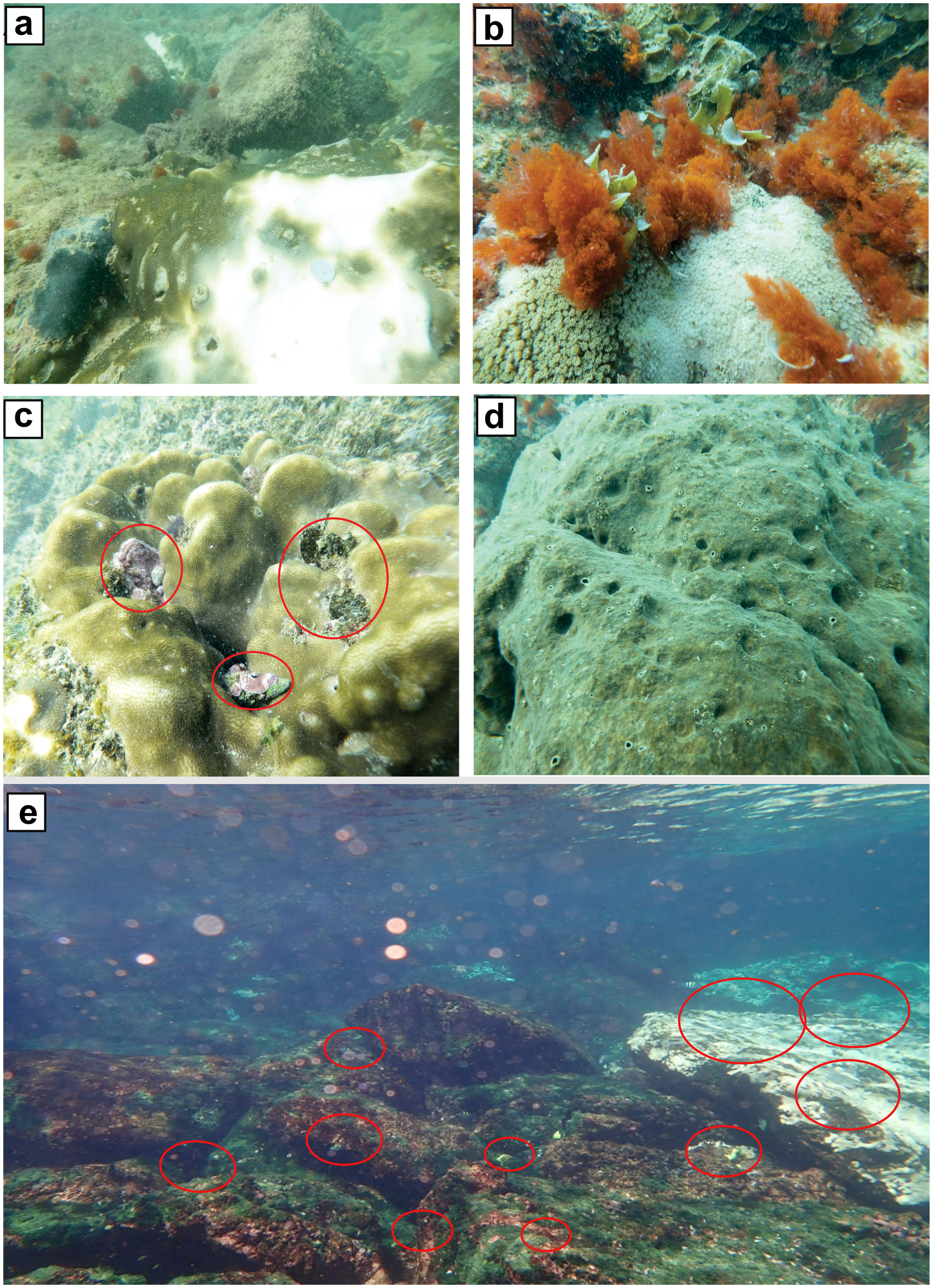 Coral reef degradation in Pakistan: (A, B, E) caused by thermal stress leading to coral bleaching, and (C, D) caused by bioerosion [modified after Ali et al. (2020); Jamal (2020)]. The red circles in the pictures clearly emphasize the areas where degradation is attributed to bioerosion.