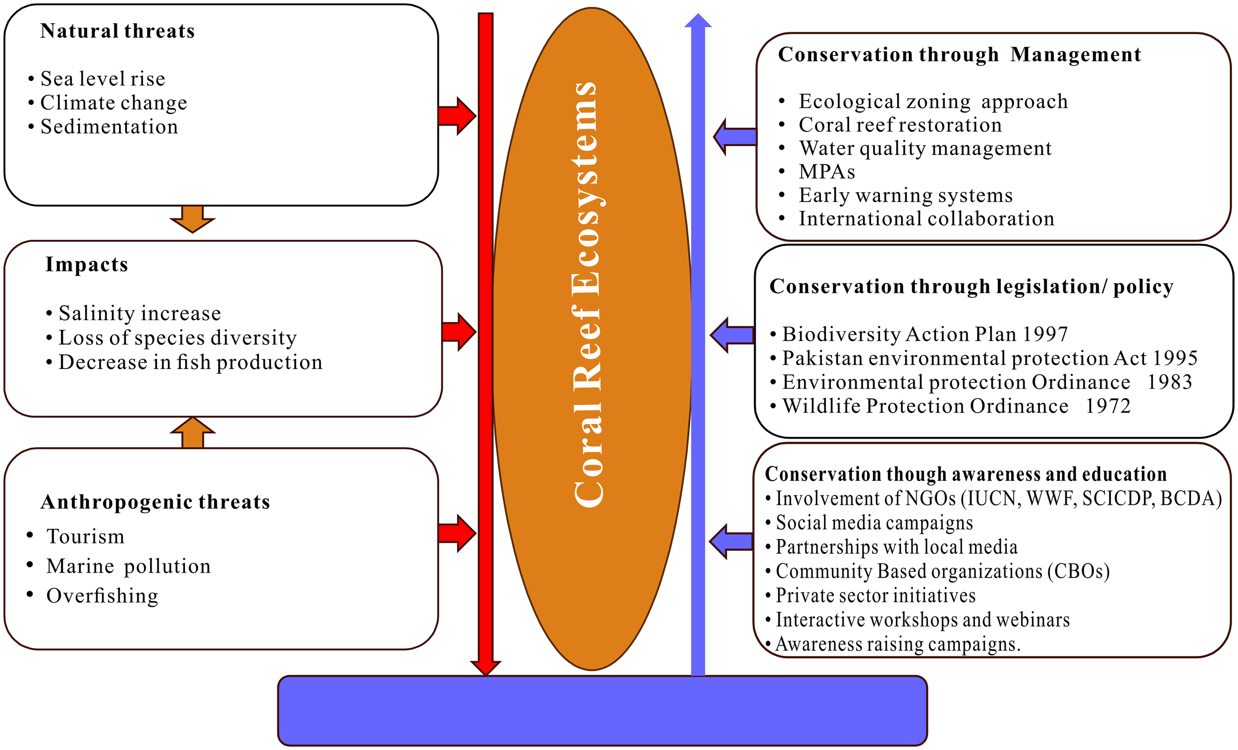 Pakistan is a federal state with three tiers of government-local, provincial, and central. They are working by established laws and regulations but the federal government taking the responsibility for the overall strategy (Ullah et al., 2022). In this context various government departments, community-based initiatives, and NGOs in Pakistan collaborate directly with coastal communities to protect coastal habitats (Table 1). These attempts usually entail joint efforts with government departments, research institutions, and organizations with these three tiers of government to achieve their goals of conserving coastal ecosystems. There is potential legislation to protect marine life (Biodiversity Action Plan 1997, Pakistan Environmental Protection Act 1995, Environmental Protection Ordinance 1983, and the Wildlife Protection Ordinance 1972) (Rajasuriya et al., 2002). Despite this, clear policies for managing coastal and marine resources have not yet been fully covered, and the existing policies, laws, and legislation in the country remain confusing and complex (Ullah et al., 2017). These factors have led to uncertainty among organizations about involving coastal communities in the planning and development process. The current laws and regulations governing coastal and marine areas in Pakistan lack an integrated management framework and only provide guidelines for environmentally friendly economic activities. However, the present situation of coral reefs and other ecosystems shows that the conservation of coral reefs requires a paradigm shift in planning and policy frameworks, management practices, research with tangible outcomes, the active involvement and coordination of stakeholders, capacity building, and a strong commitment from all relevant government bodies (Figure 5).