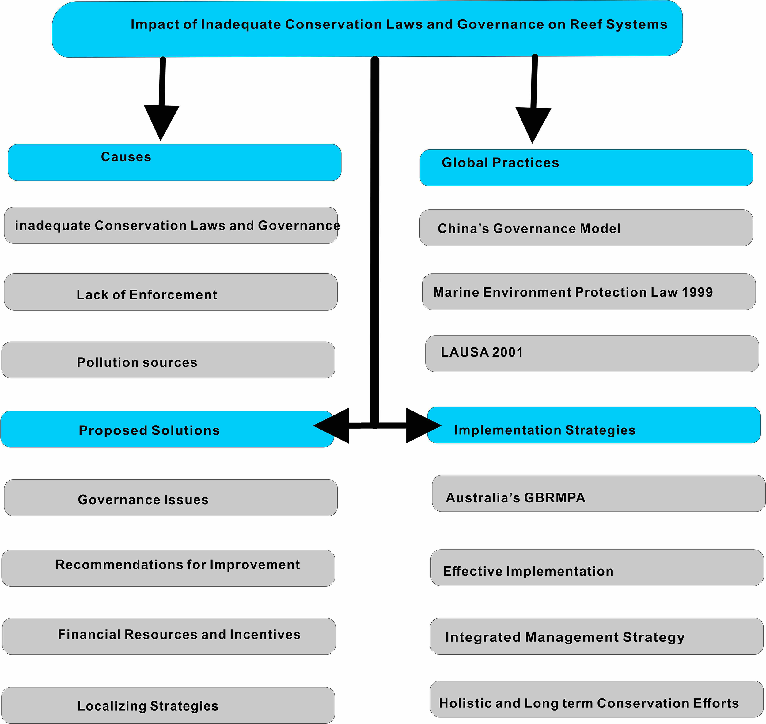 Moreover, effective coral reef conservation laws require adequate financial resources to support these invaluable marine ecosystems (Dixit et al., 2010; Ali and Hussain, 2023). An effective approach to raising funds involves imposing an environmental surcharge on commercial entities, shipbreaking operations, cargo vessels, ferry services, industrial units, hotels, and others that utilize coral reef areas for their operations or contribute to marine pollution (Byrnes and Dunn, 2020). Therefore, the government should provide incentives and tax breaks to industries that adopt pollution prevention measures. Funding should be allocated for safeguarding and protecting critical habitats and providing training and capacity building for the staff engaged in the conservation and management of coral reefs. The country lacks a regulatory framework that would support an integrated management strategy to properly manage coastal and marine resources (Ullah et al., 2021). In Pakistan, however, plans and policies are developed at the national level and implemented by lower-level governments (Pakistan, 2014). These plans also fulfil sector-specific objectives and emphasize resource marketization and privatization, resulting in a prevalent paradigm of resource empowerment or ocean governance (Pakistan, 2014). Therefore, Pakistan should meet the needs of marine environment conservation and resource usage. Implementing such a legal framework is not only critical to the sustainable management of marine biodiversity, but also contributes to ensuring that conservation efforts are holistic, consistent, and strong in the long term. Pakistan may adopt global best practices to emulate a functional conservation framework, especially from countries with successful records in marine conservation. For example, Australia’s Great Barrier Reef Marine Park Authority (GBRMPA) suggested a plan for managing large-scale marine parks through legally defined governance approaches, stakeholder engagement, and adaptive management processes (Evans et al., 2014; Stephenson et al., 2023). Similar strategies, when implemented, could act as a roadmap to enable Pakistan to develop robust marine protected areas. Pakistan can enhance its conservation practices, protect its valuable coral reefs, and ensure the sustainable utilization of marine resources for generations by understanding global lessons and localizing strategies. Adopting this integrated approach is necessary not only to address prevailing issues but also to develop resilience against other potential threats to the ecosystem. Figure 6 visually supports this discussion by illustrating the consequences of inadequate conservation laws and governance on reef systems. Showing the hierarchy of causes, global practices, proposed solutions, and implementation strategies. The arrows indicate the flow of influence and interactions between these elements, while the colors differentiate the categories for clarity.