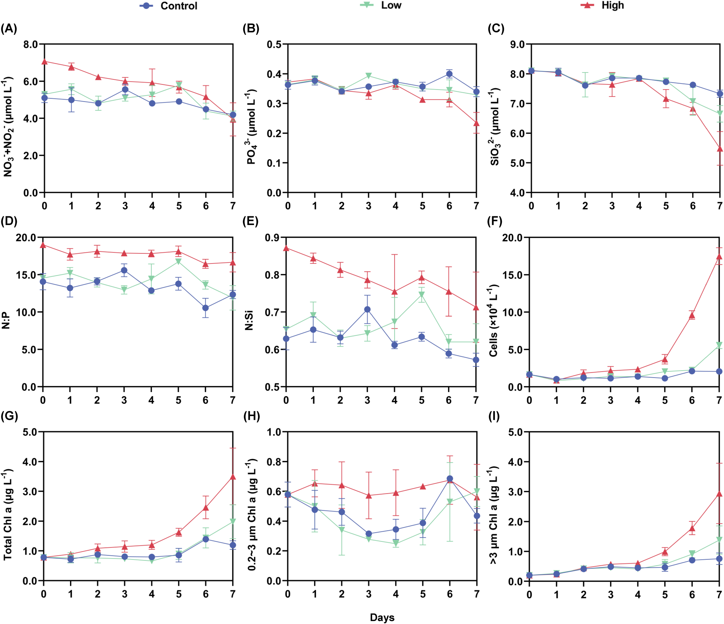 Variation in macronutrient concentrations, stoichiometric ratios and Chl a concentrations during the incubation experiment. (A) NO3-+NO2-. (B) PO43-. (C) SiO32-. (D) N:P. (E) N:Si. (F) Cell density of phytoplankton. (G) Total Chl a. (H) 0.2~3 μm fraction Chl a. (I) 3~200 μm fraction Chl a.