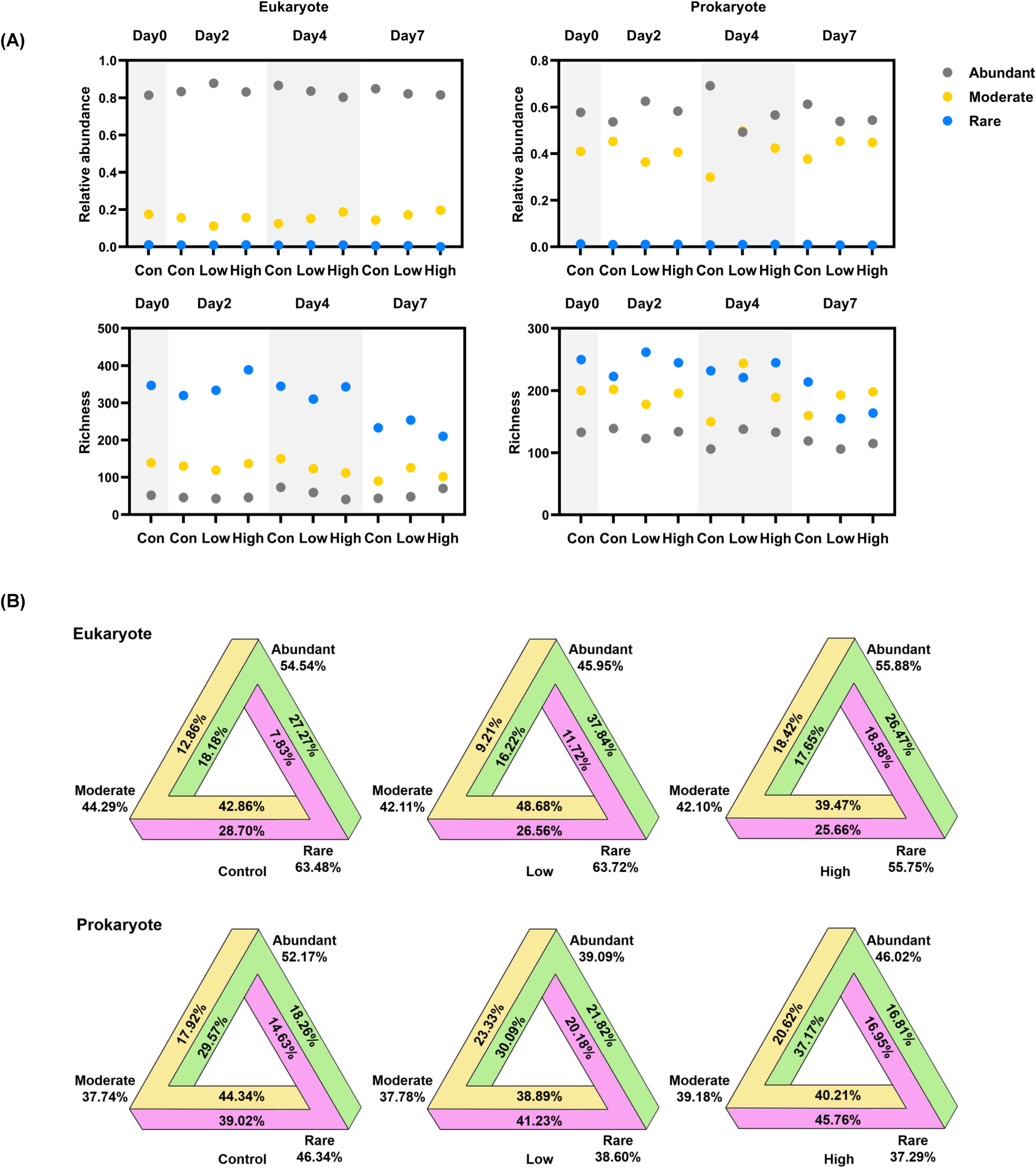 Dynamics of abundant, moderate and rare subcommunities. (A) Relative abundance and richness of abundant, moderate and rare subcommunities; (B) The proportion of each subcommunity transit to other subcommunities during the incubation (from day 0 to day 7).