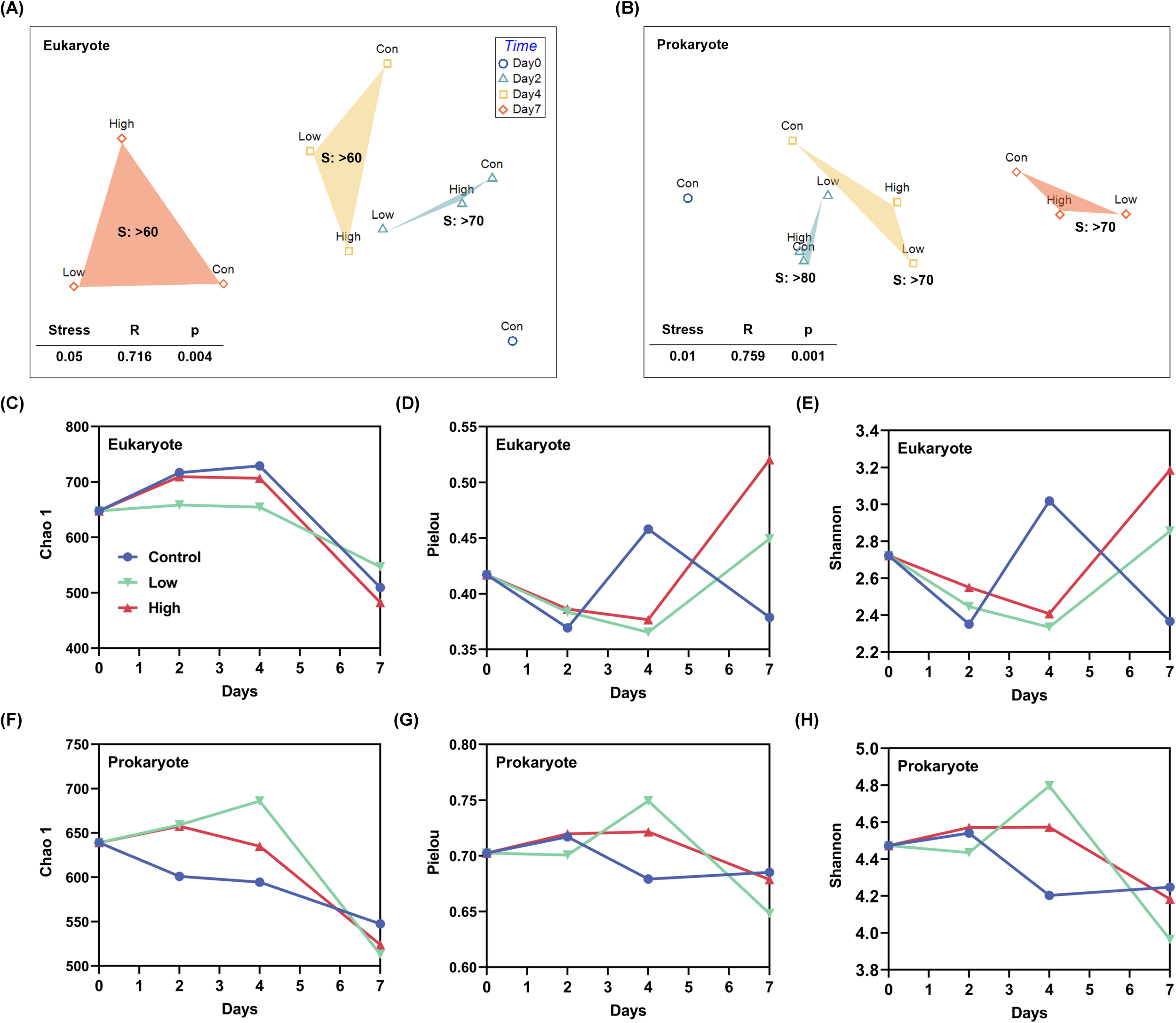 Community structuring of eukaryotic and prokaryotic plankton during the incubation experiment. (A, B) Non-metric multidimensional scaling (NMDS) ordination of plankton communities based on Bray–Curtis distances. Con, control group with no addition; Low, low group with 0.2 mg L-1 dust addition; High, high group with 2 mg L-1 dust addition; S, similarity. Variation in the α diversity (Chao 1, Pielou’ evenness and Shannon-Wiener index) of (C-E) eukaryotic and (F-H) prokaryotic microplankton communities.
