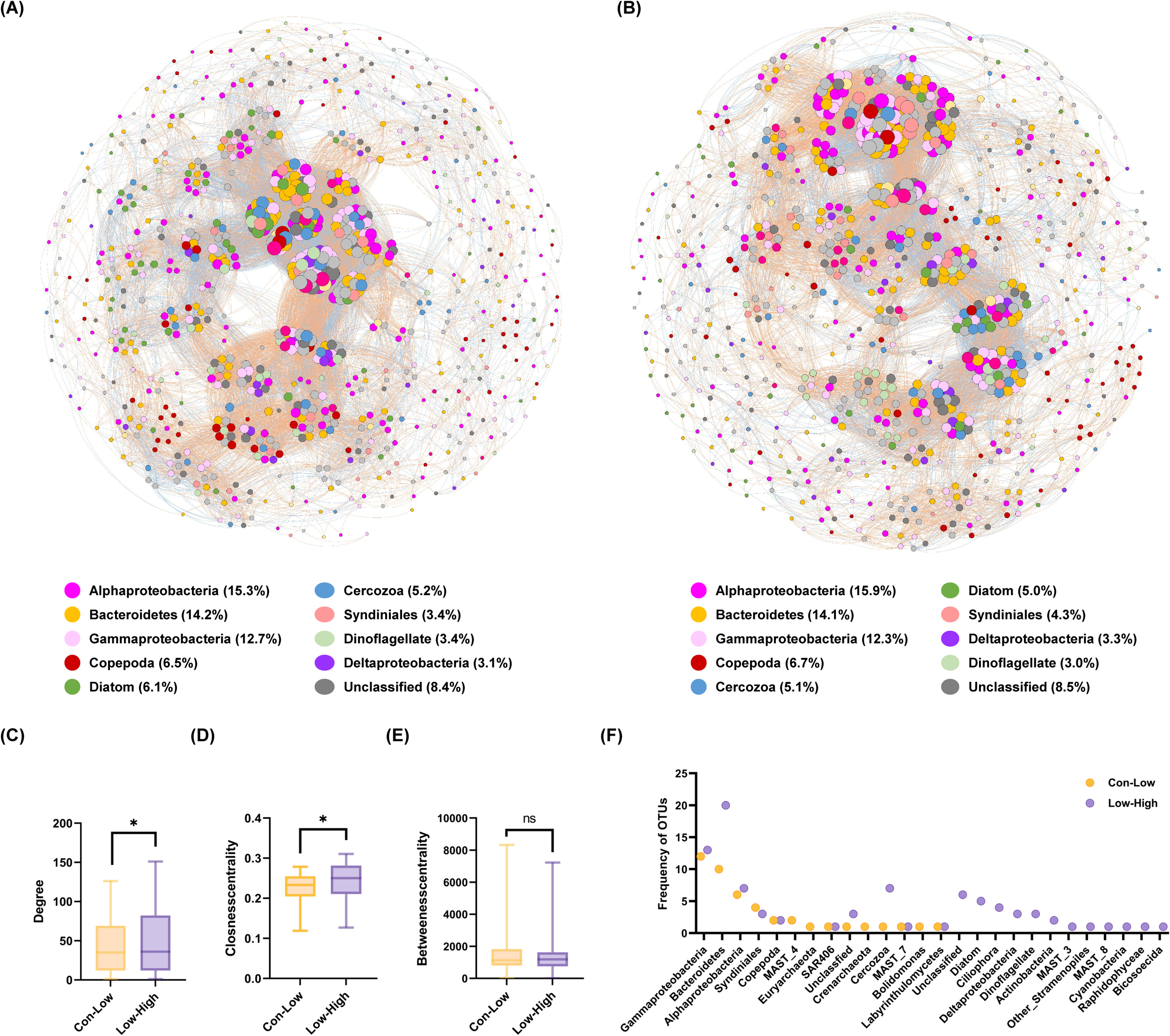 Co-occurrence networks of planktonic microbiome affected by dust addition. To ensure that the network analysis was supported by sufficient data, the Control and Low groups were merged into ‘Con-Low’ group to characterize planktonic microbial communities that were not affected or weakly affected by dust additions (A), and the Low and High groups were merged into the ‘Low-High’ group to characterize planktonic microbial communities that were affected or strongly affected by dust additions (B). The nodes of the network are colored according to taxa. The red and blue lines represent positive and negative association (edge), respectively. The sizes of the nodes are scaled to the degree of connection. (C-E) Comparison of node-level topological features (degree, closeness centrality and betweenness centrality) between two co-occurrence networks. Asterisk indicates the significant level at P < 0.05 level determined by nonparametric Mann–Whitney U test. (F) Comparison of the keystone taxa frequency between two co-occurrence networks.