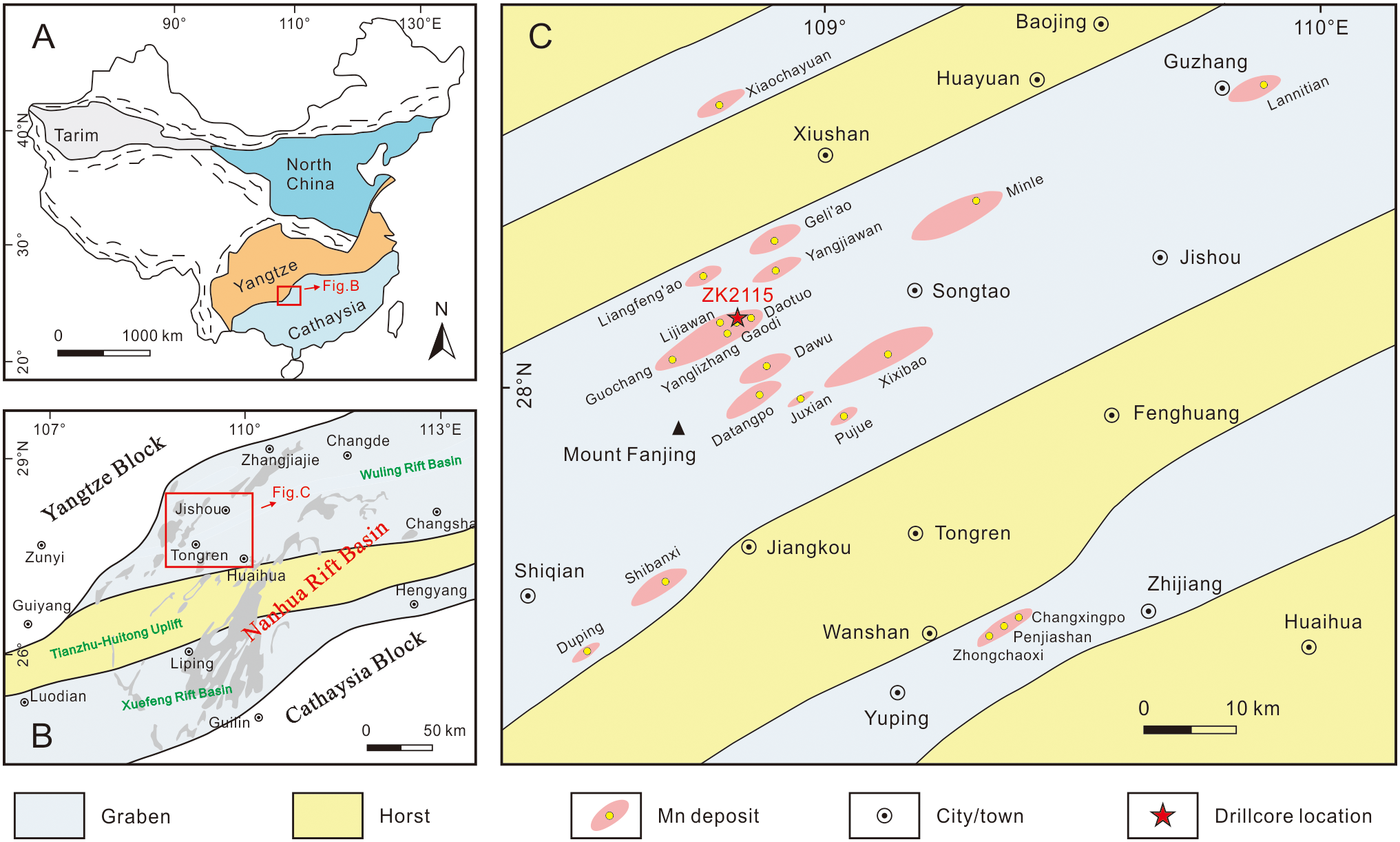 (A) Tectonic units of China. (B) Structure of the Nanhua Rift Basin on the southeast margin of the Yangtze Block (Zhou et al., 2016). (C) Distribution of Datangpo-type manganese deposits in the Guizhou–Hunan–Chongqing adjacent area (modified from Zhou et al., 2016, 2022). The study drillcore ZK2115 is marked by red stars.