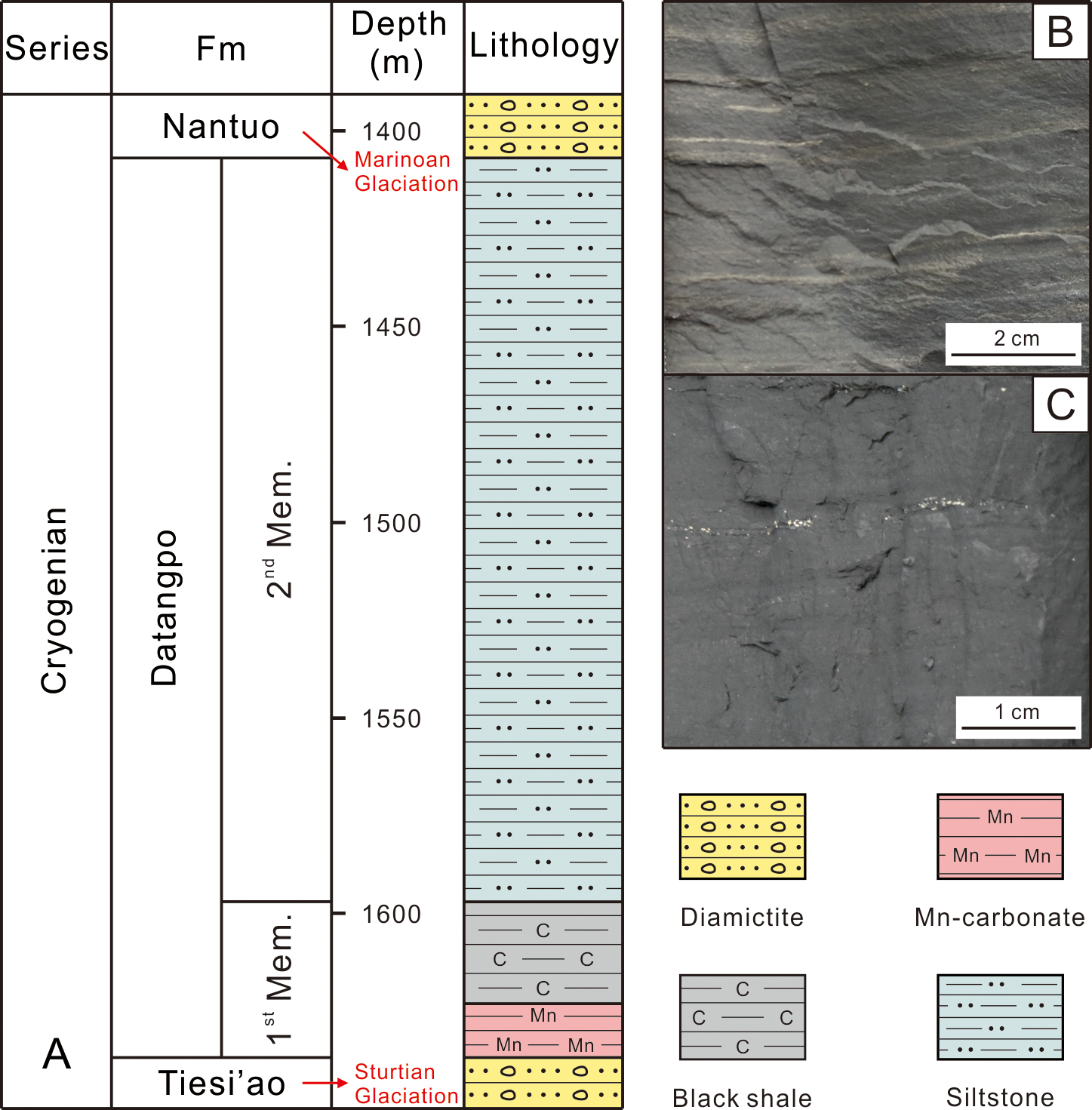 The Nanhua Basin of South China recorded complete Cryogenian stratigraphic sequence from the Sturtian Glaciation (~717–660 Ma) to the Marinoan Glaciation (~654–635 Ma). The interglacial Datangpo Fm in the Nanhua Basin is divided into two members, and the first member consists of the Mn-carbonate unit and the overlying black shale unit, containing a series of large and superlarge manganese deposits. The metallogenic process of manganese deposits is not clear, and the Mn-carbonates formed through the precursor of Mn-oxide/oxyhydroxide reduction or directly precipitated from an anoxic water column. Moreover, the redox conditions in the deep Nanhua Basin during the precipitation of manganese deposits are also controversial. In this study, the high-resolution nitrogen contents (TN), isotope compositions, carbon isotope compositions of organic and inorganic matter from the first member of the Datangpo Fm are analyzed. The δ15N values of the Mn-carbonate unit (+1.53‰ to +5.26‰, mean +3.36‰) are higher than those of the overlying black shale unit (−3.74‰ to +3.54‰, mean +0.89‰). The Mn contents show a negative relationship with TN but a positive relationship with δ15N in the Mn-carbonate unit, implying that the formation of Mn-carbonates is related to redox variations. The relatively higher δ15N values in the Mn-carbonate unit indicated oxic conditions, and NH4+can be released and partially oxidized during the mineralization of organic matter, resulting in the residual 15N-enriched NH4+ being transferred into clay minerals. Meanwhile, the lower δ15N values in the black shale unit indicated anoxic conditions, which recorded primary N isotope signals. The Mn-carbonate unit is characterized by negative δ13Ccarb values (−11.17‰ to −5.22‰, mean −8.30‰), which show a positive relationship with δ13Corg, but a negative relationship with Mn contents, implying that the negative δ13Ccarb excursions were related to the organic matter degradation during Mn-carbonate formation. The findings of this study indicated that the metallogenesis of manganese deposits in the Cryogenian Nanhua Basin was constrained mainly by the oxic interval in the deep basin. The nitrogen and carbon cycling process can provide new insights into geochemical cycling after the Sturtian Glaciation.
