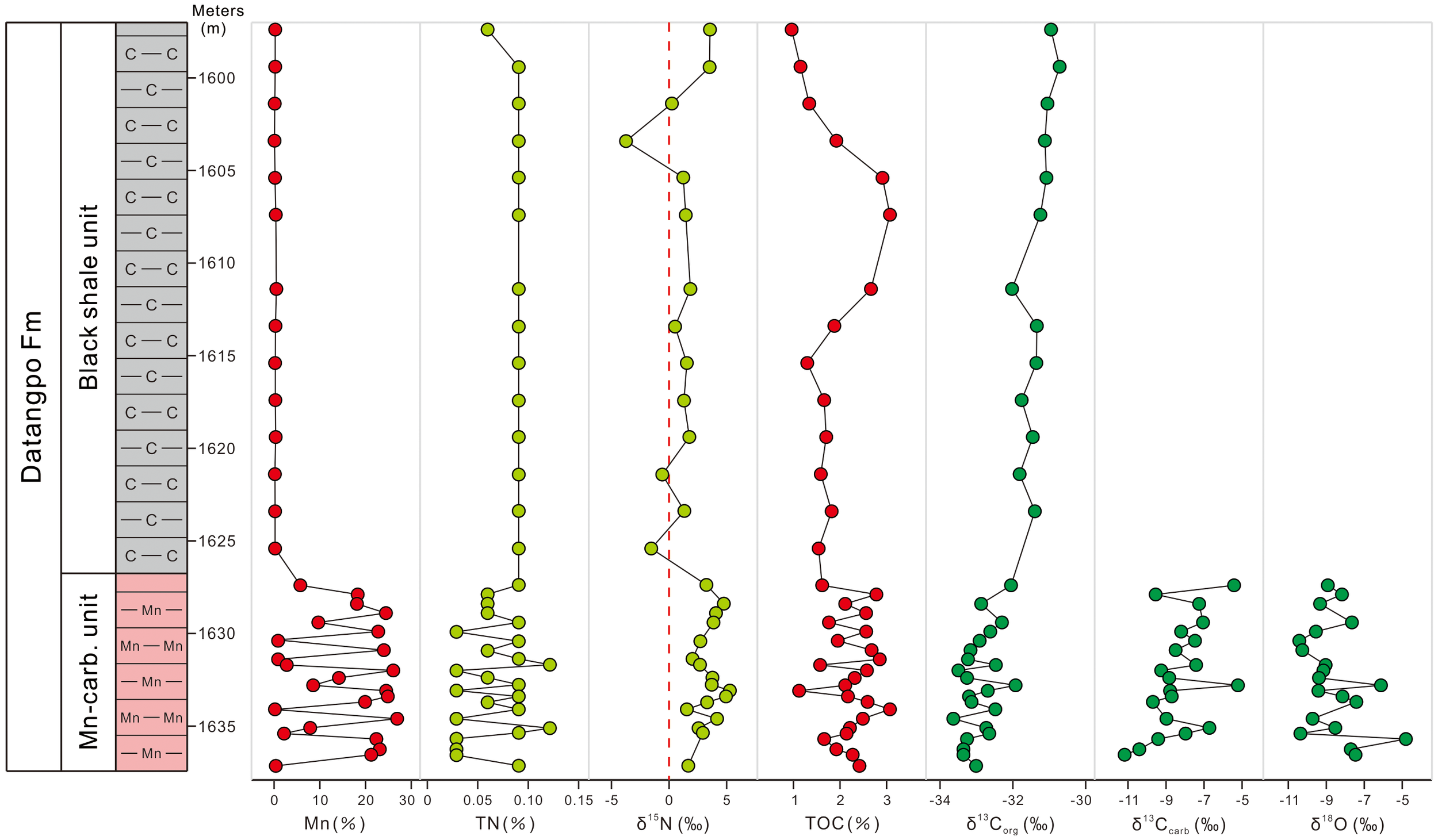 This study focuses on the drillcore ZK2115, which is located in the Gaodi Manganese Deposit, eastern Guizhou Province. The high-resolution nitrogen and carbon geochemical data are analyzed for the Mn-carbonate unit and the overlying black shale unit of the post-Sturtian Datangpo Fm. Combined with the previously reported total organic carbon (TOC) and Mn contents in the study units, the redox proxy-δ15N values suggested that the deep basin was oxic during the precipitation of the Mn-carbonate unit, which facilitated the metallogenic process of the manganese deposits. The Mn-carbonate formation experienced the Mn2+ oxidation and reduction stages, leading to the negative δ13Ccarb excursions in the basal Datangpo Fm. Carbon and nitrogen cycling in the Cryogenian is reconstructed, which can also provide new insights for the global N–C cycling throughout Earth’s history.