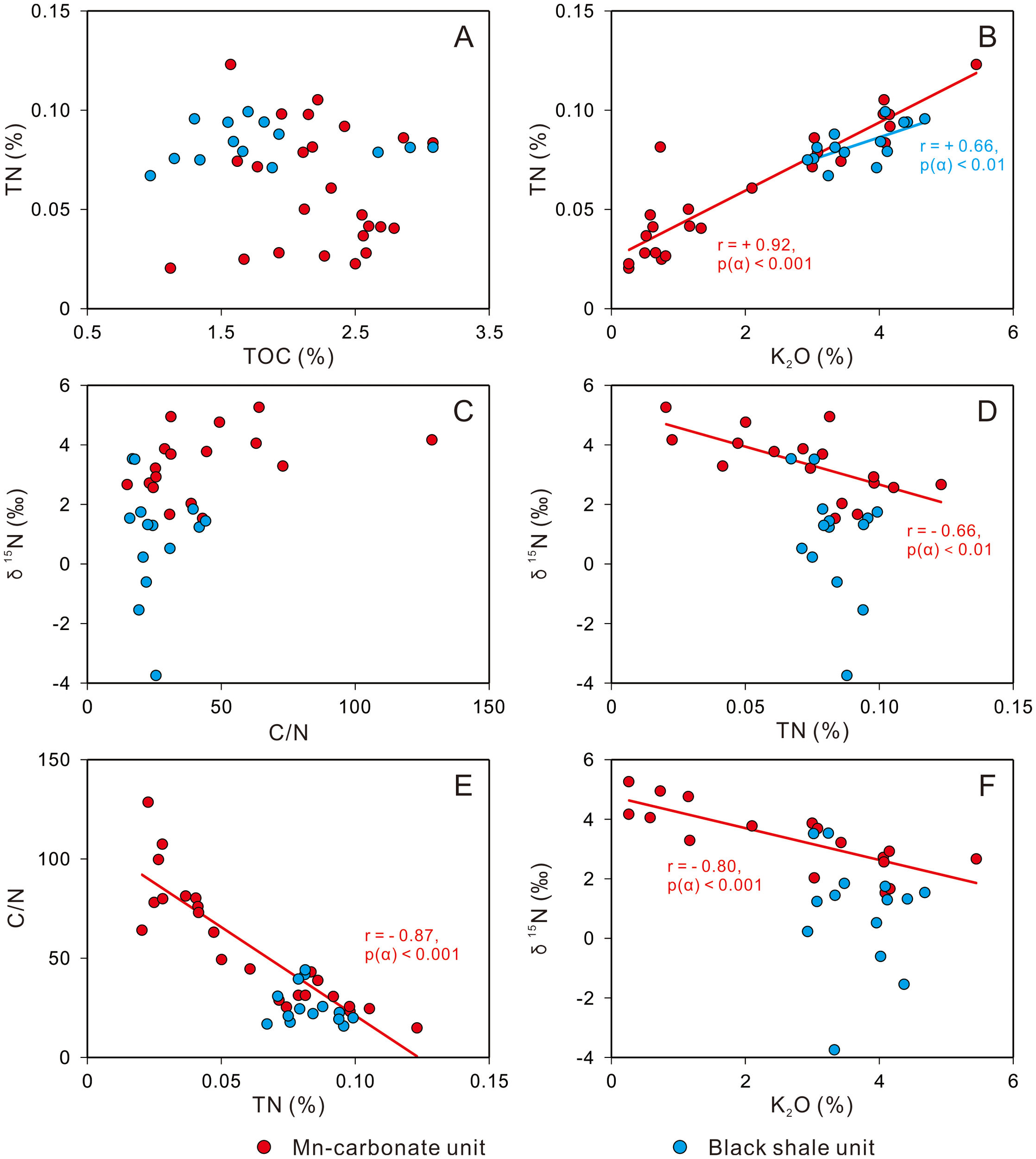 Cross-plots of TOC-TN (A), K2O-TN (B), C/N-δ15N (C), TN-δ15N (D), TN-C/N (E), and K2O-δ15N (F) in the Mn-carbonate unit (red color) and the overlying black shale unit (blue color) of the Datangpo Fm in the drillcore ZK2115. TOC and K2O contents are collected from Wang et al. (2019b, 2020).