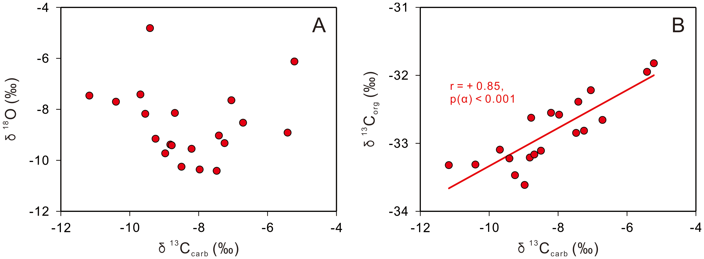 Cross-plots of δ13Ccarb-δ18O (A) and δ13Ccarb-δ13Corg(B) in the Mn-carbonate unit of the Datangpo Fm in the drillcore ZK2115.