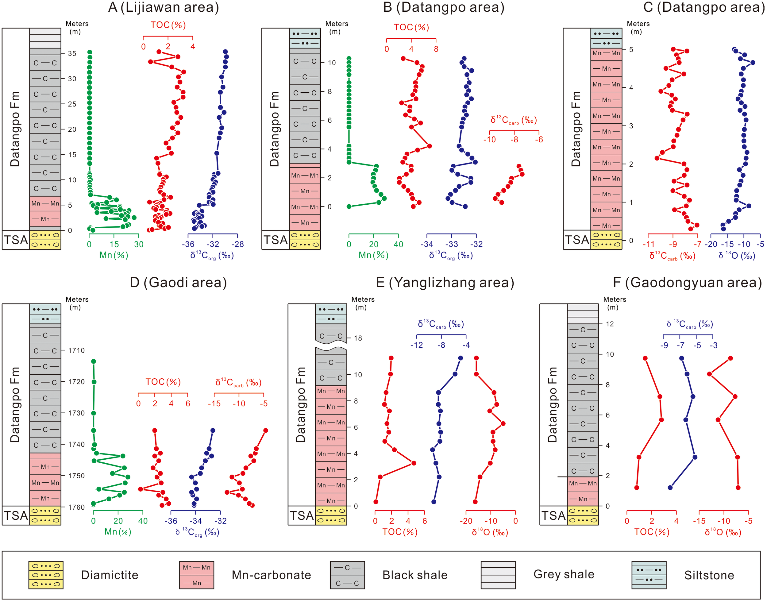 Mn, TOC, and δ13C profiles for first member of the Datangpo Fm of Lijiawan area (A; Li et al., 2022), Datangpo area (B, C; Zhou et al., 2007; Tan et al., 2021), Gaodi area (D; Pei et al., 2020), and Yanglizhang area (E; Zhu et al., 2019) in Guizhou Province and Gaodongyuan area in Chongqing City (F; Zhu et al., 2019). TSA, Tiesi’ao Fm.