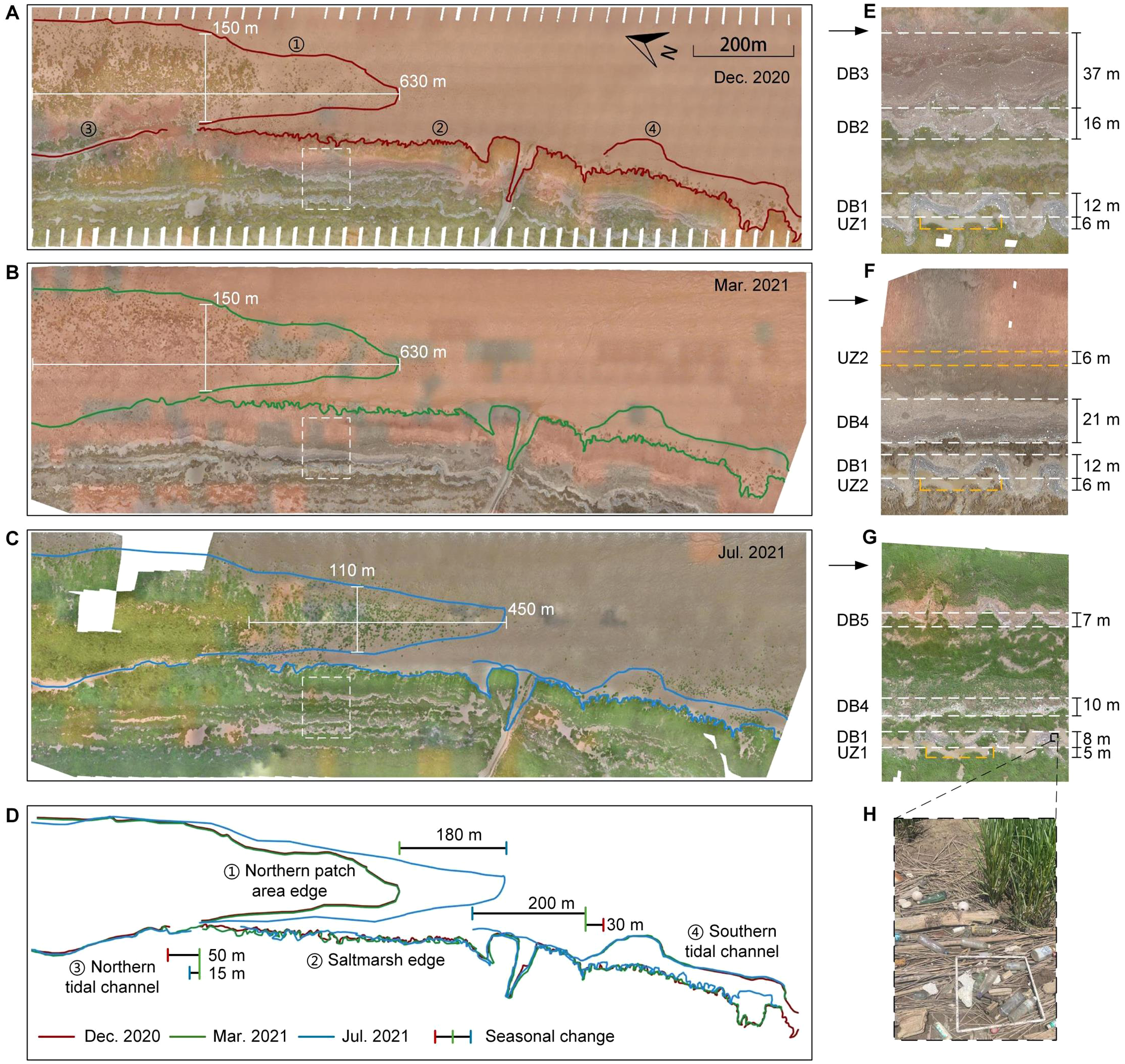 The UAV orthoimages of the tidal flat at Doulong Harbor in (A) December 2020, (B) March 2021 and (C) July 2021. (D) showed the outlines of morphological patterns. The white and yellow dashed boxes, magnified in (E), (F) and (G), showed the evolution of the debris bands (DB) and unvegetated zones (UZ). (H) showed the common debris.