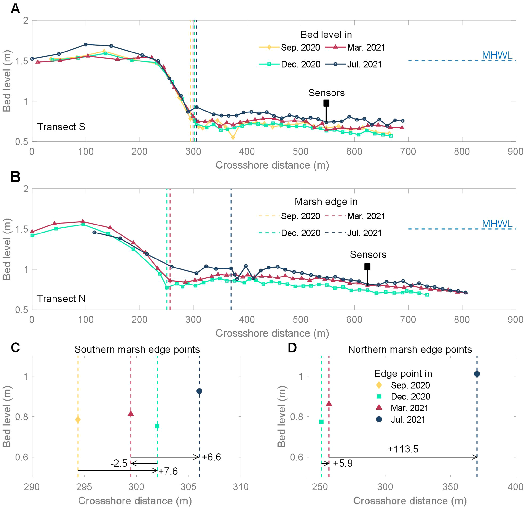 Bed level change of the transect S (A) and the transect N (B). Marsh edge points shift of the transect S (C) and the transect N (D).