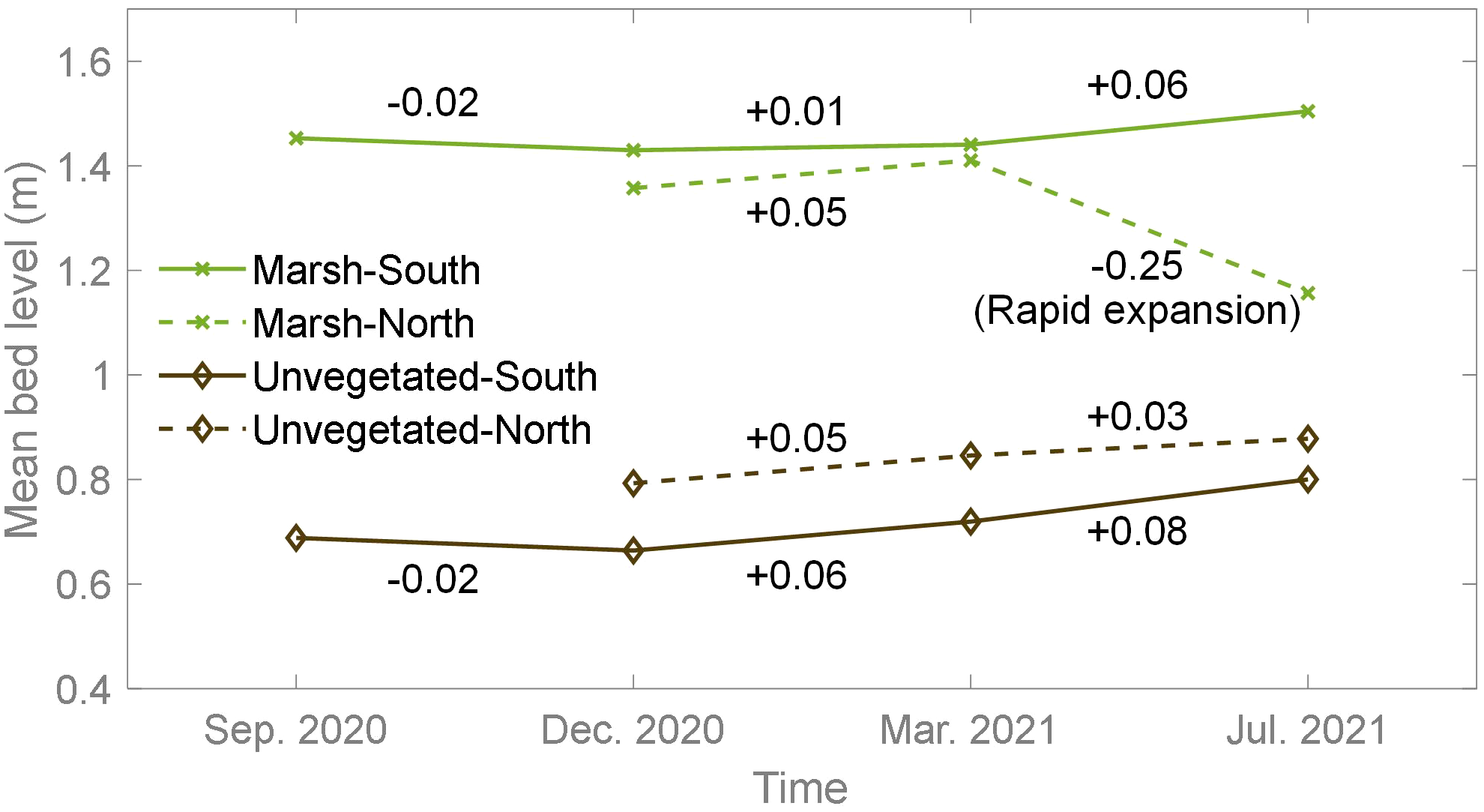 The southern marsh edge point shifted seaward by 7.6 m from September 2020 to December 2020, then retreated by 2.5 meters from December 2020 to March 2021, and subsequently shifted seaward again by 6.6 meters from March 2021 to July 2021 (Figure 3C). The movement distance between each season was less than 10 meters, indicating a gradual seaward expansion of the southern saltmarsh over annual time scales but with seasonal oscillation. The northern marsh edge point also shifted seaward, but the movement was much larger and the distance reached 113.5 m from March 2021 to July 2021 (Figure 3D). From December 2020 to July 2021, the vertical elevation of both the southern and northern edge points increased. The increase of the northern point (0.24m) was slightly greater than that of the southern point (0.17m).