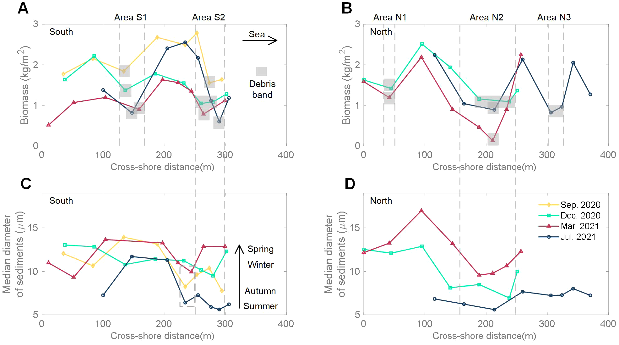 Biomass and median sediment grain size (D50) in the marsh of transect S (A, C) and transect N (B, D).