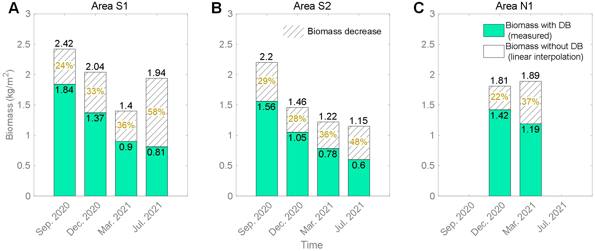 The percentage decrease of biomass due to the debris bands (DB) in Area S1 (A), Area S2 (B) and Area N1 (C). The “Area” corresponds to the region with debris bands in Figures 6A, B.