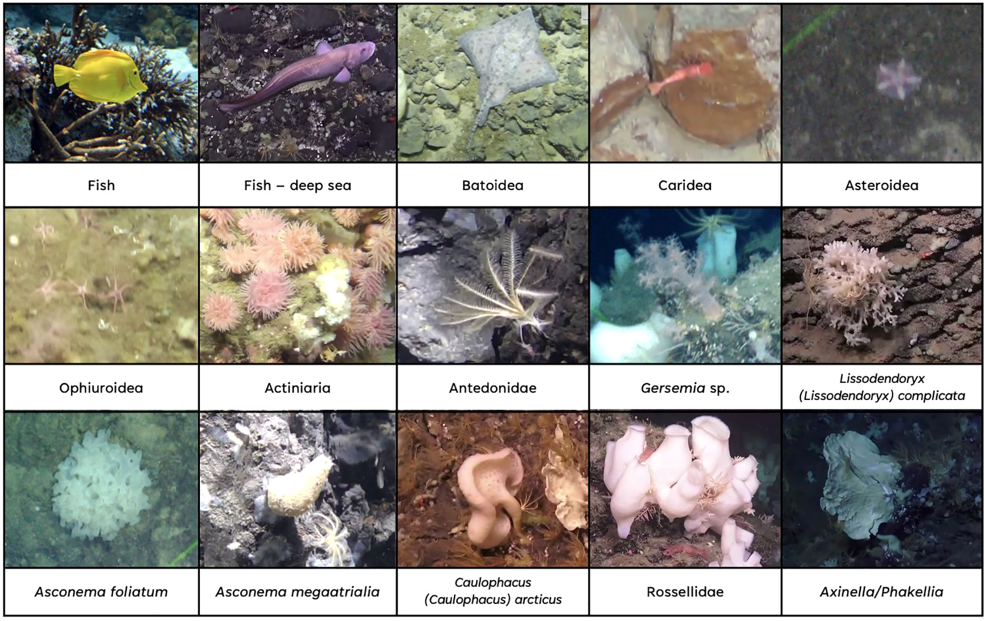 Organisms are only annotated if it was possible to classify them into one of the classes without context (i.e., not by association with another individual from the same class present in the image). For some classes that tend to occur in clusters, like L. (L.) complicata and Rossellidae, it is challenging to distinguish individuals from each other. These are annotated as separate individuals where there is a clear spatial separation visible between the specimens in the image. L. (L.) complicata is only labelled if it is represented as at least a small “bush”. Small dendritic fractions are not annotated as they cannot be uniquely identified as such.