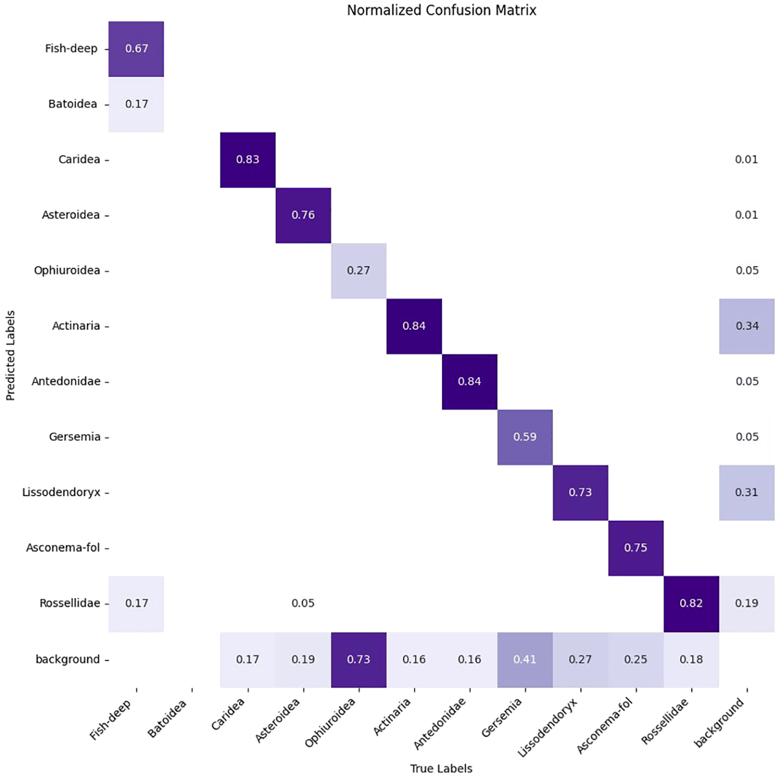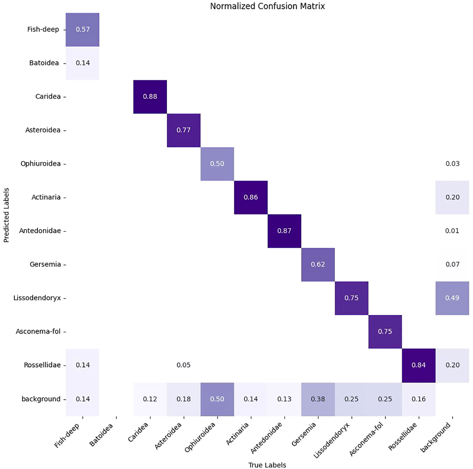 Training is carried out on the DeepSee dataset using a 75/25 split for training and validation over 400 epochs. The number of epochs is chosen based on multiple iterations of model training where a flattening of the performance metrics is observed after ca. 250-350 epochs (Figure 4). The image size is set to 1280 pixels and batch size to 8 during training. We tested multiple batch sizes and found that increasing batch size results in a slight hit in model accuracy for our setup. Training is carried out on 4 Nvidia T4 GPUs. Object inference on a single image including post-processing takes ca. 35-60 milliseconds on a single Nvidia 4070 GPU, depending on the image complexity. The Yolov8 model uses the precision metric to identify the best model. See Table 1 for the performance metrics. Precision is the fraction of relevant instances or true positives among all retrieved instances. Recall is the fraction of relevant instances (true positives) that were retrieved to the total number of ground truth instances. The F1 Score is the harmonic mean of precision and recall, providing a balanced assessment of a model’s performance while considering both false positives and false negatives (Supplementary Figure S1). mAP50 is the mean average precision calculated at an intersection over union (IoU) threshold of 0.50 and is a measure of the model’s accuracy. The trained model has a high mAP50 score of 0.84 over all classes. The high precision and mAP scores also show that false positives are kept to a minimum for most classes. This is also reflected in the confusion matrix where the detections are largely confined to the diagonal (Figure 5). A confusion matrix is a table layout that allows visualization of model performance by quantifying the detection errors or how the model confuses different classes during detection. For example, reading Figure 5 vertically for the ‘Fish’ class, the model correctly predicts the ‘Fish’ class in 76 out of 100 cases and predicts it as ‘Background’ in 23 out of 100 cases (false negative). When read horizontally, the model correctly predicts the ‘Fish’ class in 76 out of 100 cases and incorrectly predicts instances of ‘Batoidea’ as ‘Fish’ in 19 out of 100 cases (false positive). The only classes with mAP50 scores lower than 0.8 are Fish-deep and Batoidea. The confusion matrix shows that these classes are often predicted as background, i.e. not detected, explaining the relatively low mAP50 scores. This is also reflected in low recall scores for these classes. This is most likely due to the low number of images and instances of these classes in the training dataset. The mAP50-95 score, or mean Average Precision over IoU thresholds from 0.5 to 0.95, measures model performance at multiple higher levels of localization precision, making it a more rigorous metric than mAP50. mAP50-95 scores are generally lower than mAP50 scores as it assesses not only detection accuracy but also the tightness of bounding boxes.