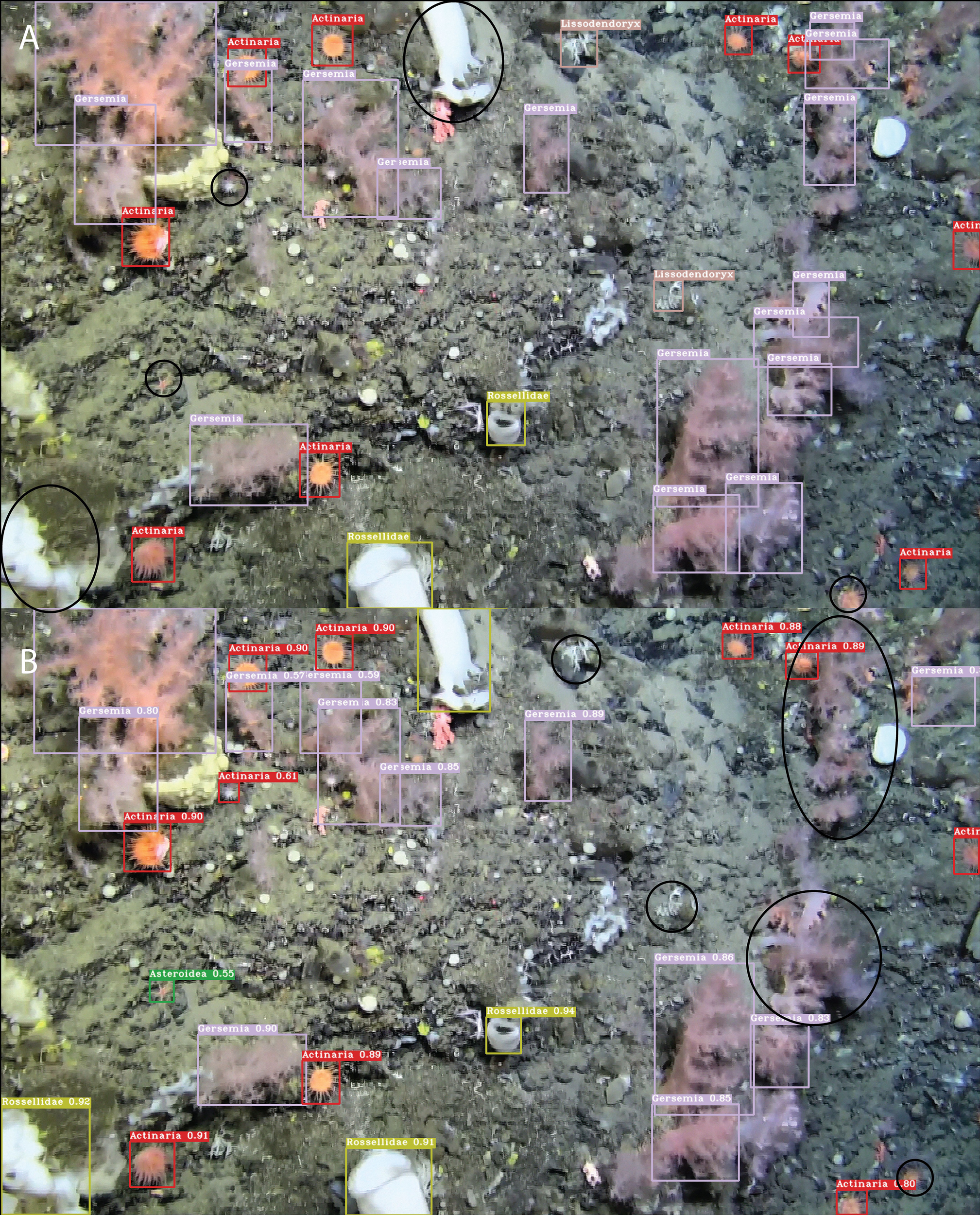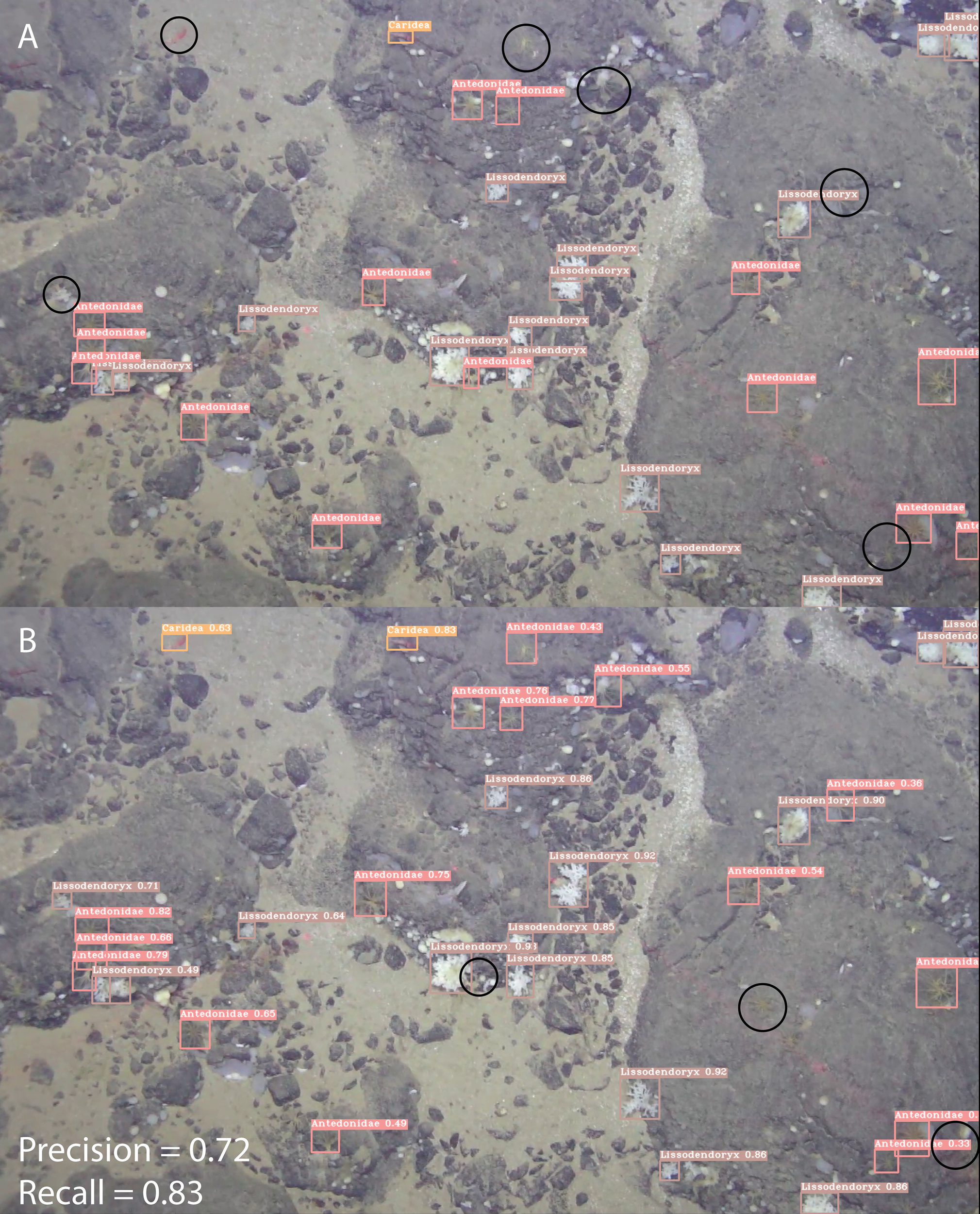 Figure showing the comparison between the manually annotated (A) and detected labels (B) in an example image. Instances that are labelled in the ground truth image and not found by the DeepSee model, and vice-versa, are encircled in black. The average precision and recall of the model detections for the image are 0.72 and 0.83, respectively. However, it is evident that the ‘false positives’ detected by the model are indeed valid detections that were missed in the annotated dataset. When corrected, the average precision and recall increase to 1 and 0.91, respectively. Images are from the Meyer dataset.