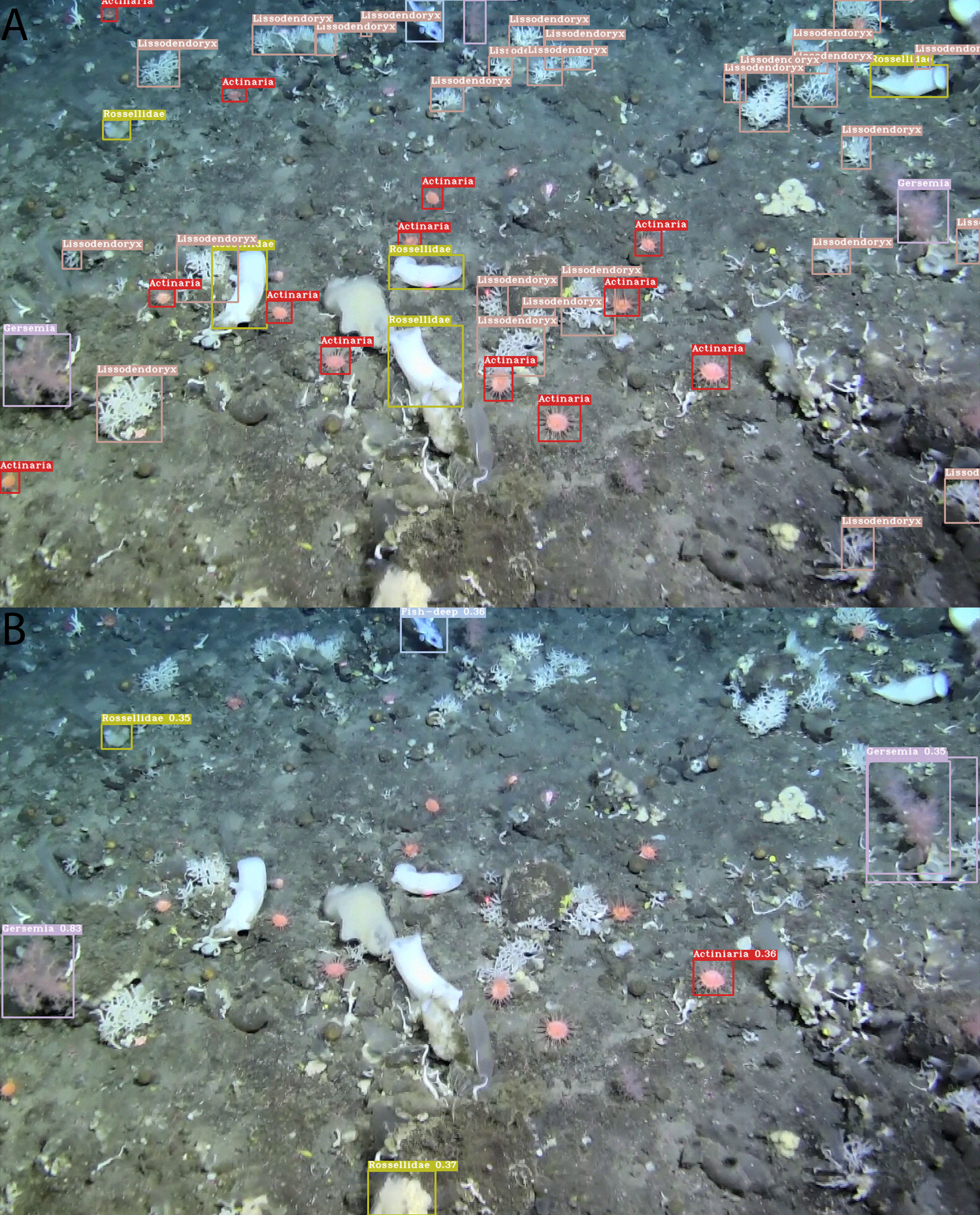 The trained DeepSee model achieves a high mAP50 score of 0.84 on validation data, indicating strong accuracy and minimal false positives across most classes. Inference times for images sized at 1280 pixels range from approximately 20 to 35 milliseconds per frame, demonstrating the model’s efficiency. The DeepSee model is further benchmarked against 48 images selected from the Meyer (Meyer et al., 2022; Meyer et al., 2023) dataset covering the range of habitat types and organisms present in the DeepSee dataset. Note that these images are not used for DeepSee model training and validation. The Meyer dataset catalogues benthic organisms on the Schulz Bank, a seamount of the Artic Mid-Ocean Ridge, using ROV video footage from 580 to 2700m depth. The Meyer study also provides instance counts of the identified organisms for each image in the dataset. However, these counts include not only clearly visible organisms but also obscured or fragmented organisms that do not display the characteristic features of their class as required for ML classification. These additional counts were identified by tentative association with other organisms in the image or by physical sampling (Heidi Kristina Meyer, pers. comm.). For example, in Supplementary Figure S2, where all clearly visible organisms in the DeepSee dataset are annotated, 3 instances of Lissodendoryx are identifiable. In contrast, the Meyer study counts 7 Lissodendoryx instances here (Meyer et al., 2022). Therefore, for benchmarking and comparative purposes in this study, the dataset has been manually re-annotated to align with the classification and methodology used for the DeepSee model as outlined in Section 2 to provide the ground truth instance count, rather than using the instance counts provided by the Meyer study. Inference is carried out using the DeepSee model and the results are compared to the annotations. The resulting validation metrics are shown in Table 2 and the confusion matrix in Figure 6. The validation metrics and confusion matrix show that the model does an excellent job in detecting most organisms in the dataset with mAP50 scores higher than 0.7. The only exception to this is the Ophiuroidea class where the metrics are relatively low. False positives, with respect to other classes in the dataset, are minimized except for the Fish-deep class (Figure 6). Figure 7 is an example that shows a comparison between the manually annotated (Figure 7A) and DeepSee detected (Figure 7B) images. The Caridea, Antedonidae and Lissodendoryx classes with high mAP50 scores are annotated/detected in the example figure. The example figure has only 1 instance of Caridea annotated but the model returns two detected instances. As it stands, the precision and recall of this class would be 0.5 and 1, respectively. However, the ‘false positive’ detection is indeed a missed manual ground truth annotation of the Caridea class. Accounting for this (Supplementary Figure S3), the precision and recall of this class reaches a perfect score of 1 for this class in the example (Table 3). This effect is also observed in the other classes present in the figure. There are 15 Antedonidae instances detected by the model of which 4 are ‘false positive’. In reality, there are no false positives when the manual annotations are corrected. The precision and recall for this class increase from 0.73 and 0.79, respectively, to 1 and 0.83. Similarly, 15 instances of Lissodendoryx are detected with 1 ‘false-positive’ which is a misannotated instance. When the annotations are corrected, the precision and recall of this class are both 1.