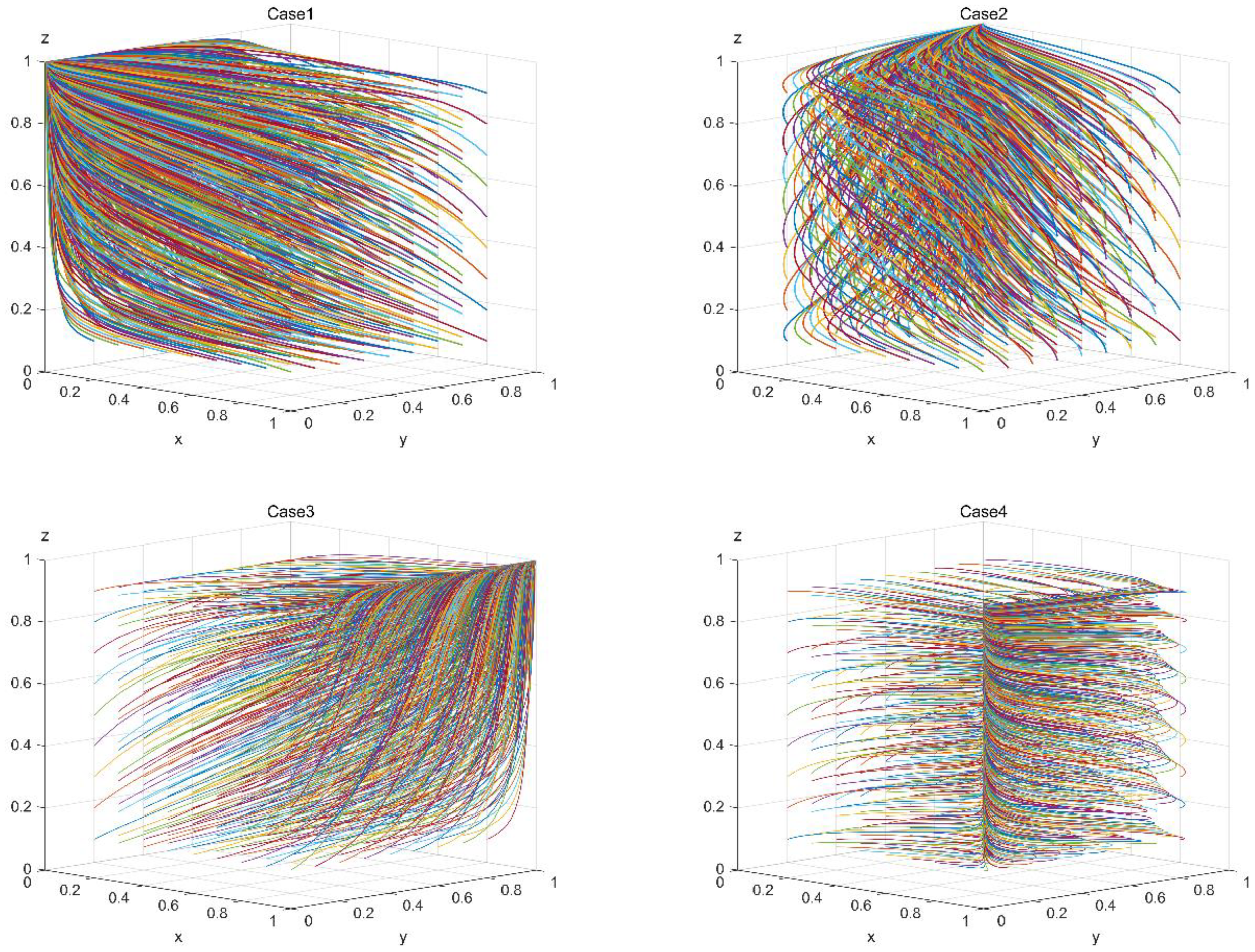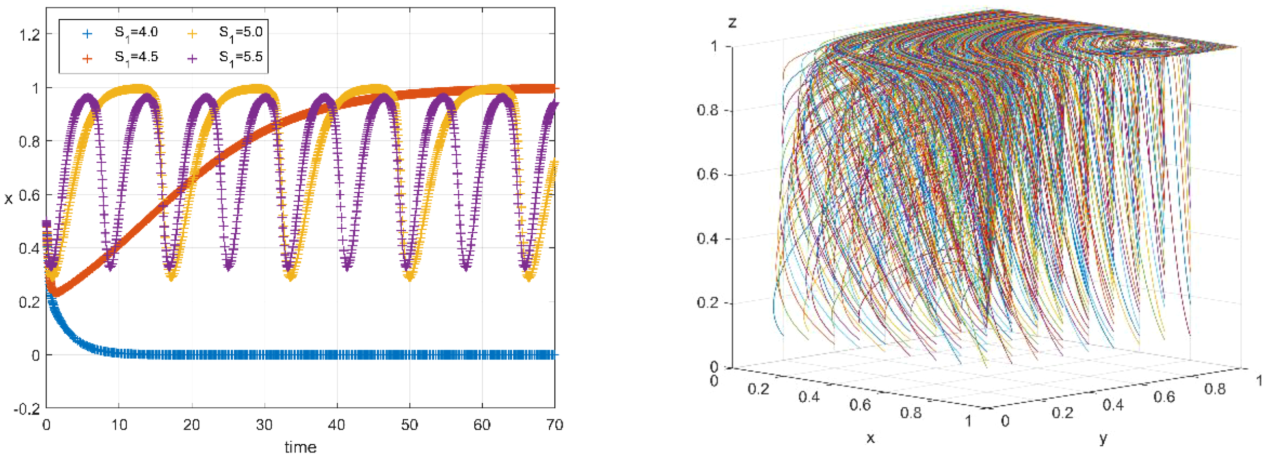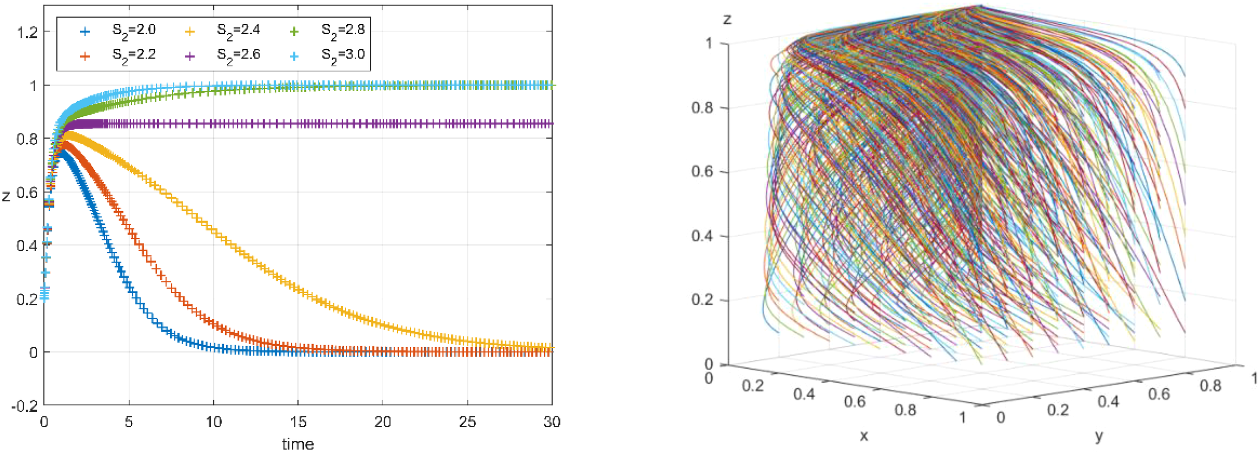 For the consumers, when y , at this point, , and the consumers cannot determine a stable strategy. But when , , and z = 0 is the evolutionary stable point for the consumers. On the contrary, when , , and z = 1 is regarded as a stable strategy for consumers. The phase diagram of the replication dynamics for the MRE, government, and consumer parties is shown in Figure 2.