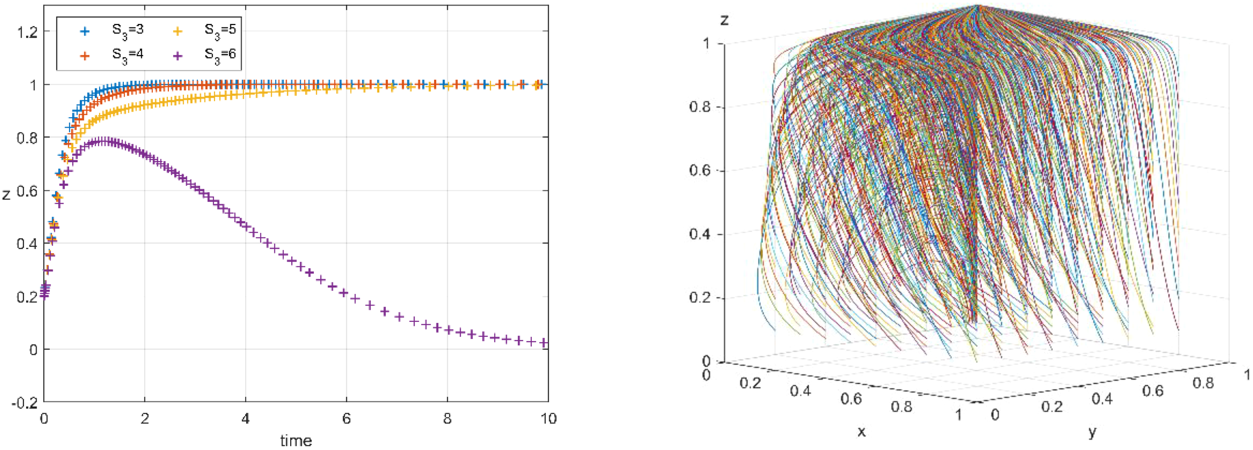According to the stability theorem of the differential equation of evolutionary game, in order to keep a certain strategy in a stable state, the probabilities x, y and z of MRE, government and consumers choosing this strategy must be satisfied respectively: , ; , ; , . Based on the above analysis, according to Equations 5, 10 and 15, when , at this point, , and the strategy chosen by the MRE is not stable. However, when , , and x = 0 is the evolutionary stable point for the MRE. Conversely, when , , and x = 1 is the evolutionary stable point.