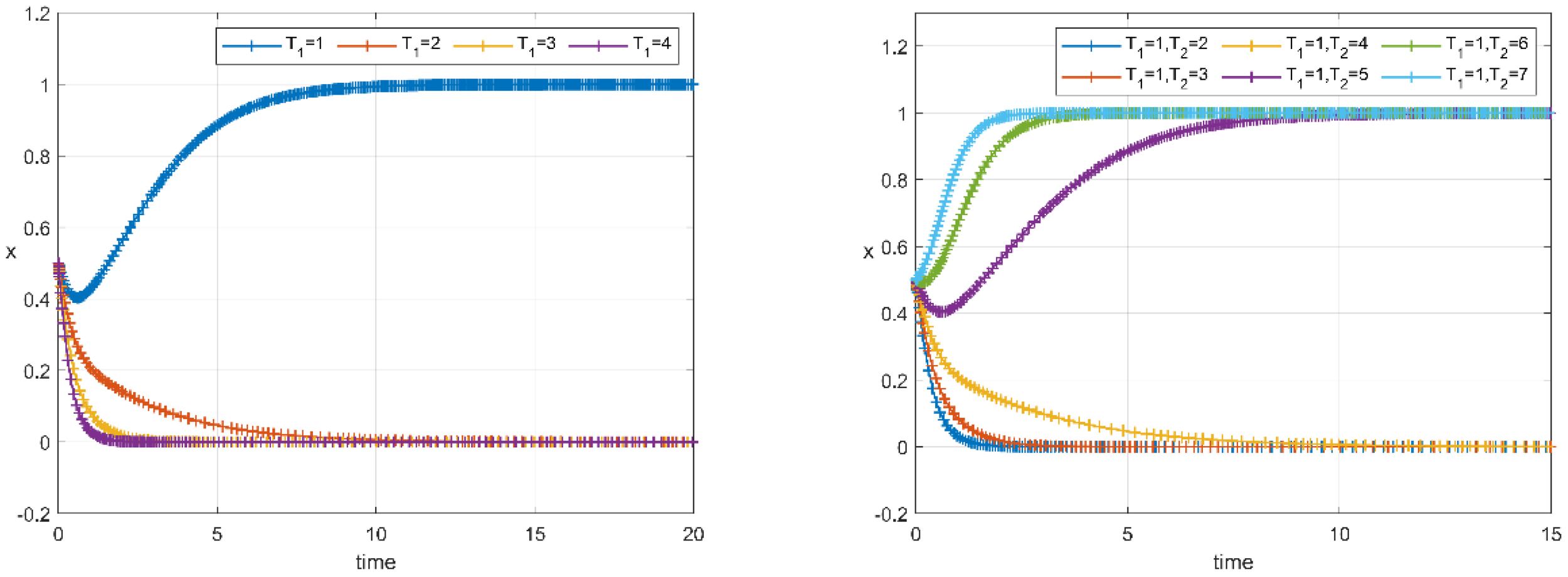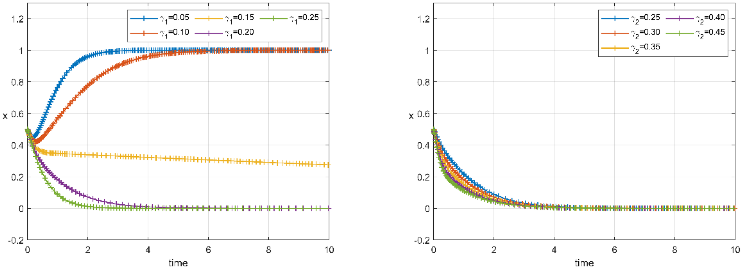 For the government, when , at this point, , and the government’s strategy is not a stable strategy. Nevertheless, when , , and y = 1 is the evolutionary stable point for the government. In contrast, when x , , and y = 0 is the evolutionary stable point.