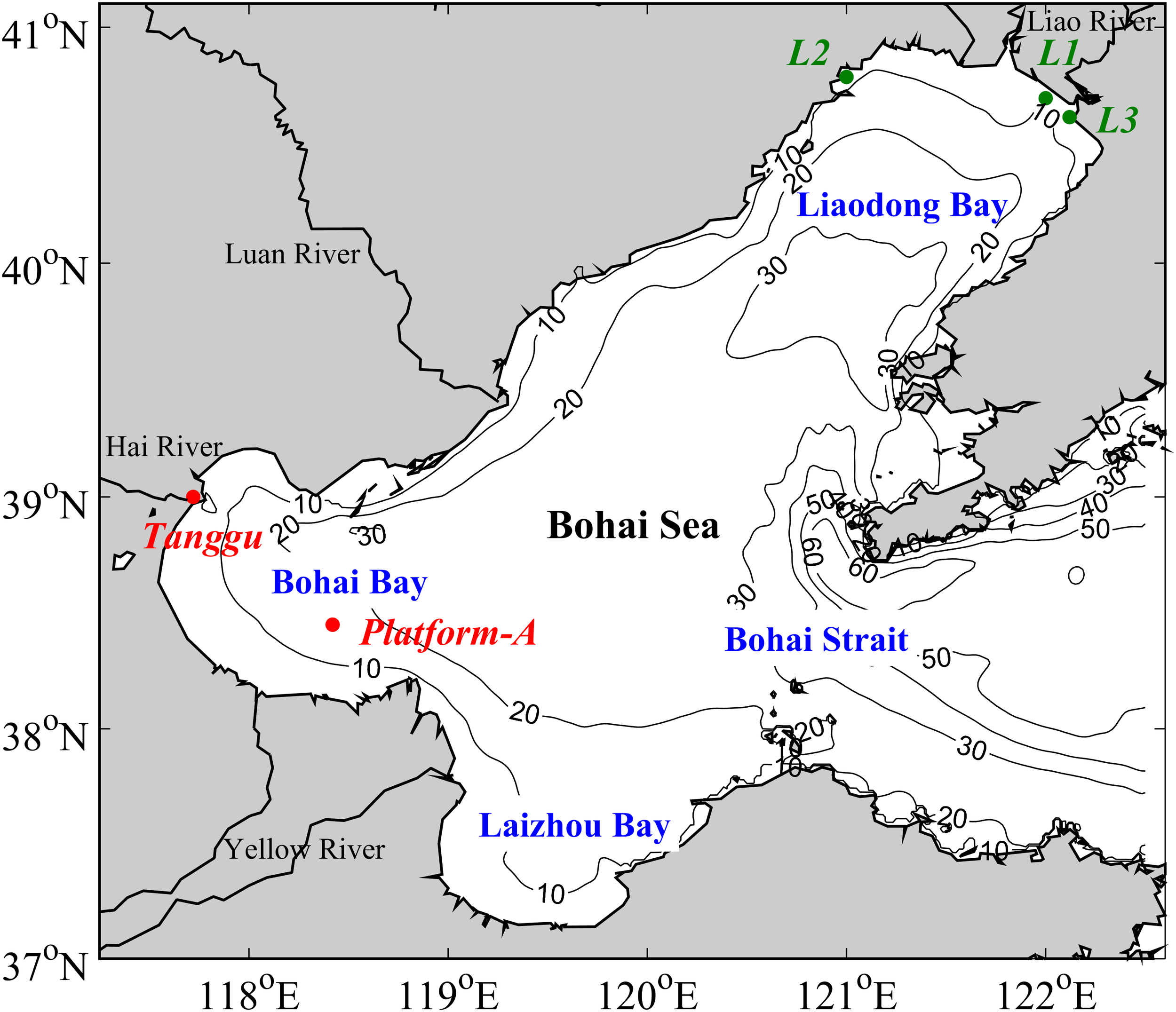 Bathymetry of the Bohai Sea (m). The Liaodong Bay, Bohai Bay, Laizhou Bay, and the Bohai Strait are marked in blue on the map. The positions of the two observation stations (Tanggu and Platform-A) are marked in red points. The positions of the three local waters [Erjiegou water (L1), Dabijiashan water (L2) and Xipaotai water (L3)] on the top of Liaodong bay are marked in green points.