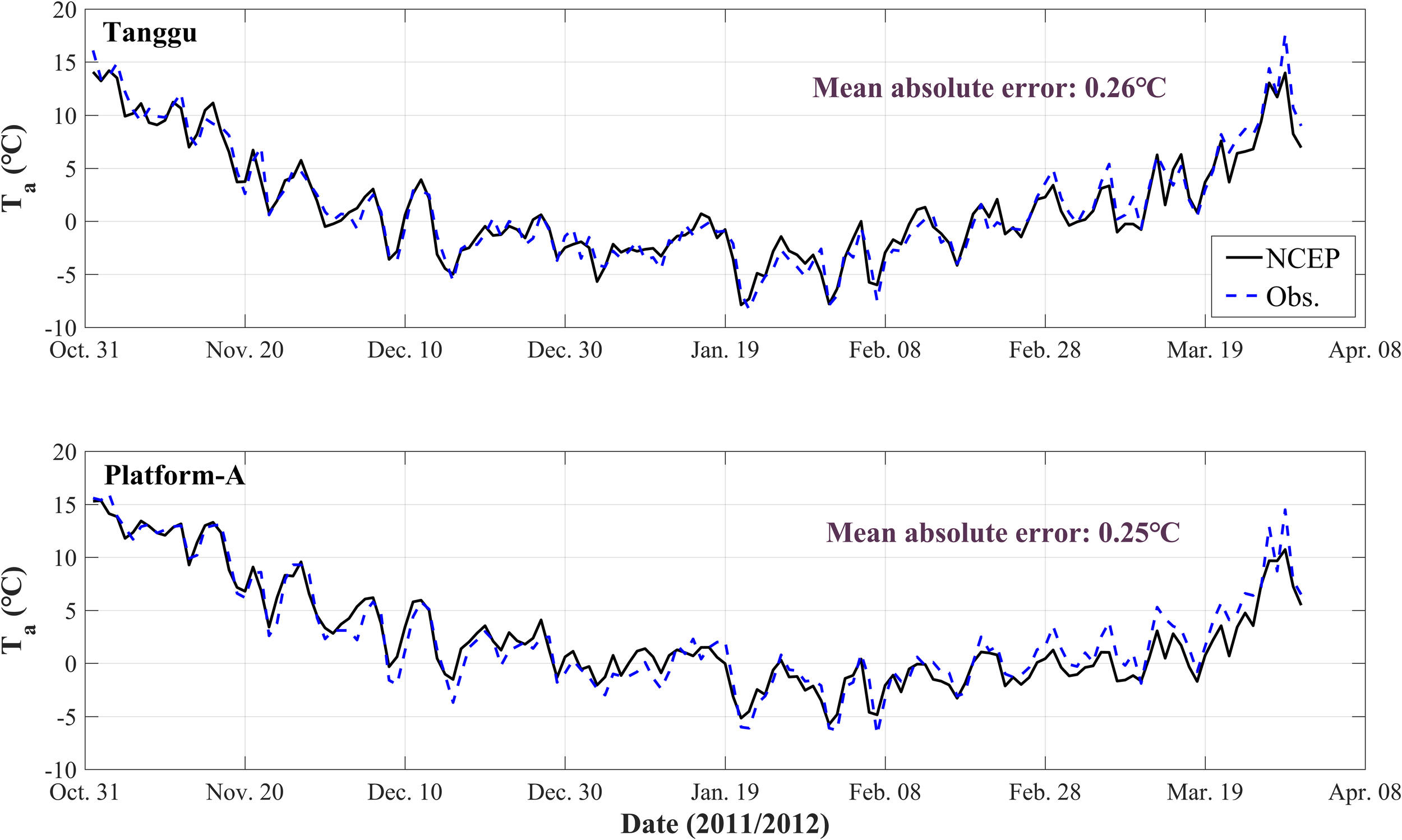 Comparison of the NCEP 2m air temperature (solid black line) and the corresponding observations (blue dashed line) at the Tanggu station (top) and Platform-A station (bottom) during the winter of 2011/2012. The mean absolute error of each station is indicated in the respective graph.