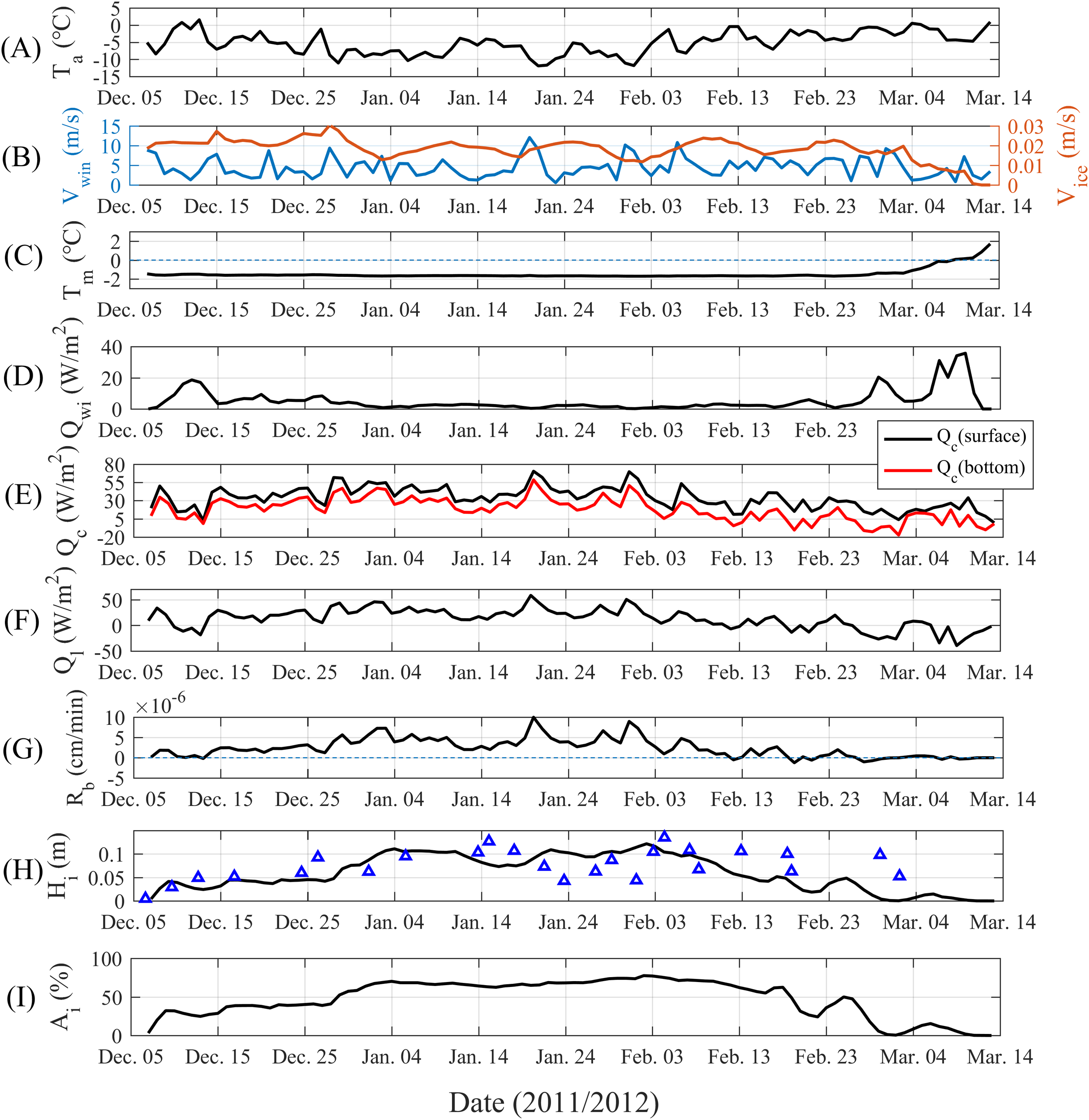 The time series of ice coverage-averaged variables [including sea surface air temperature Ta(A), sea surface wind speed Vwin and ice drift velocity Vice(B), the mixed layer temperature Tm(C), the oceanic heat flux Qwi(D), the conductive heat flux through ice Qc(E), the latent heat flux Ql(F), freezing/melting rate of ice base Rb(G), ice thickness Hi(H) and ice concentration Ai(I)] during the 2011/2012 ice season. The blue triangles in graph (H) are the inversion data for ice thickness from GOCI ocean color remote sensing satellite.